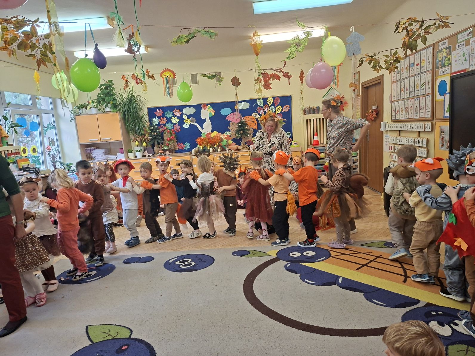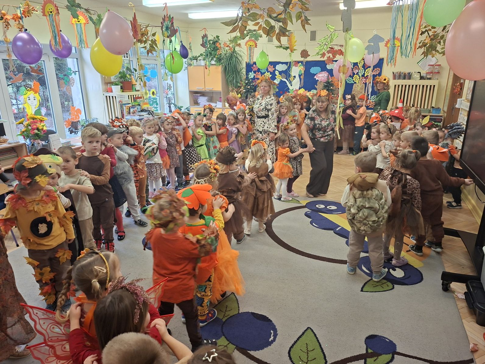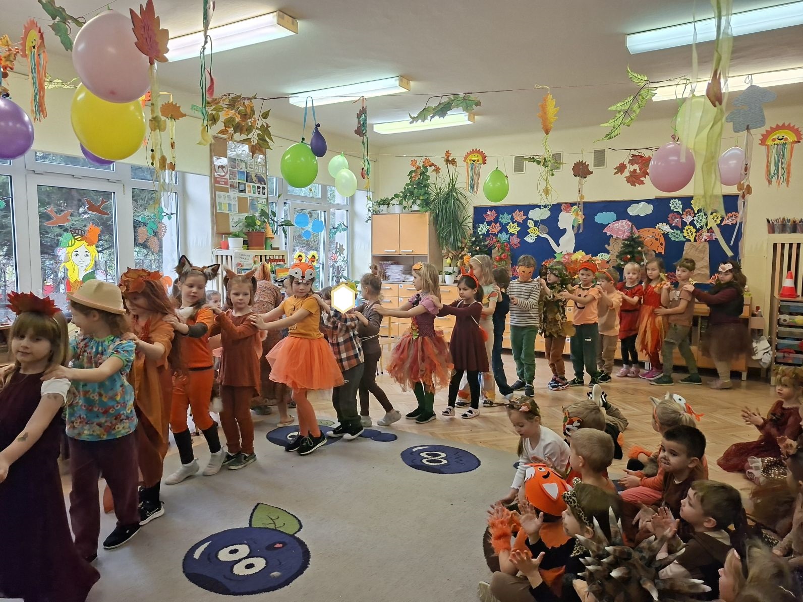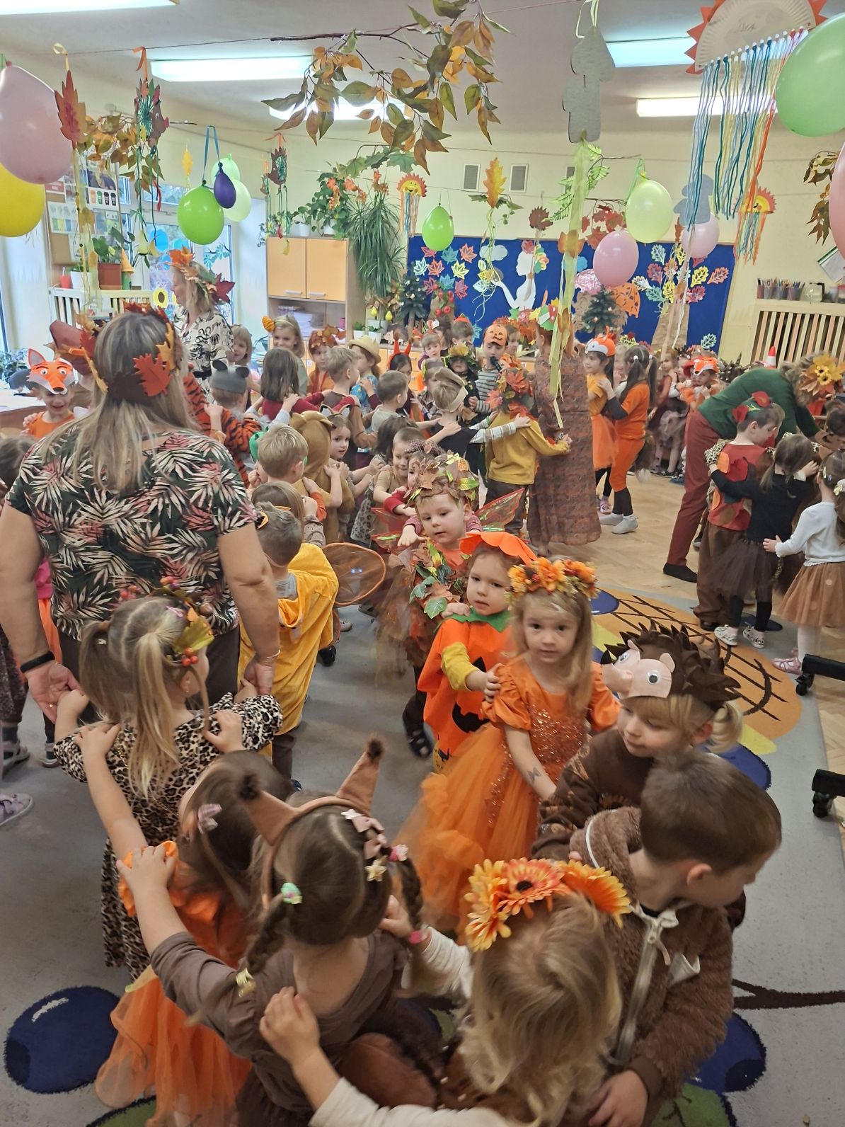 Przedszkolaki przebrane w różnorodne, jesienne stroje: grzybki, liście, dynie, panie jesień, jeżyki, kasztanki, itp. bawiły się przy jesiennych piosenkach. Brały też udział w różnych pląsach, korowodach, konkursach, rozwiązywały jesienne zagadki. Na koniec każda z grup zaprezentowała swoje stroje poruszajac się w jesiennym pociągu.