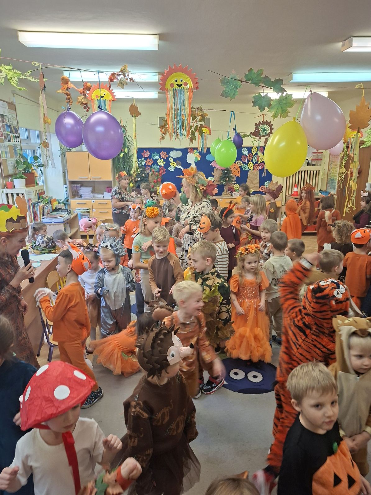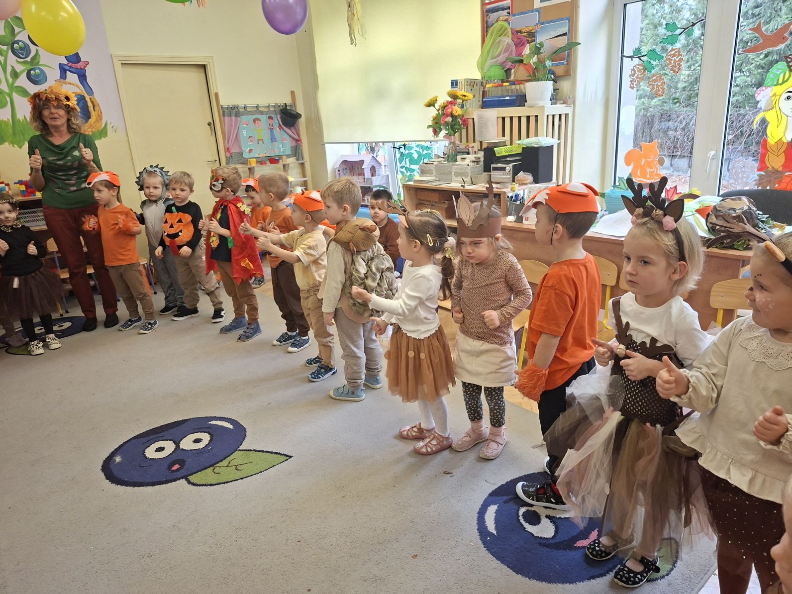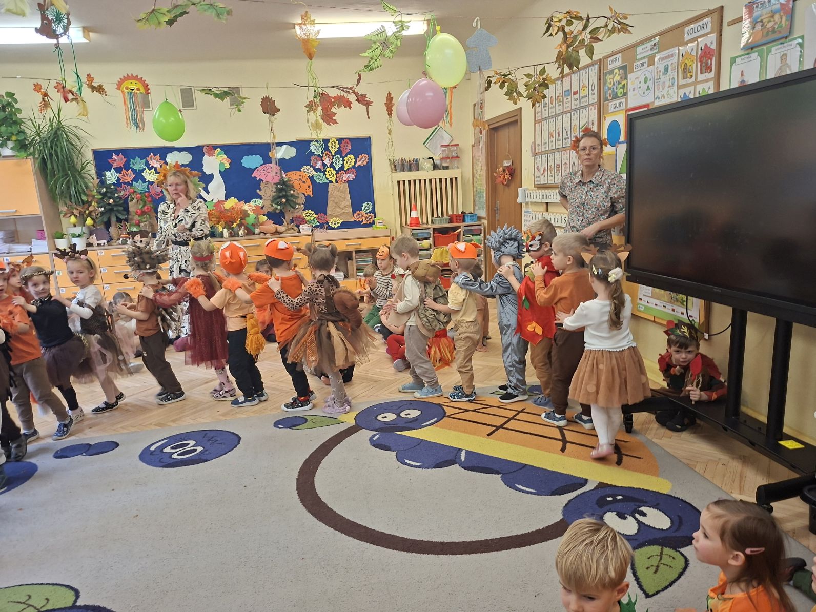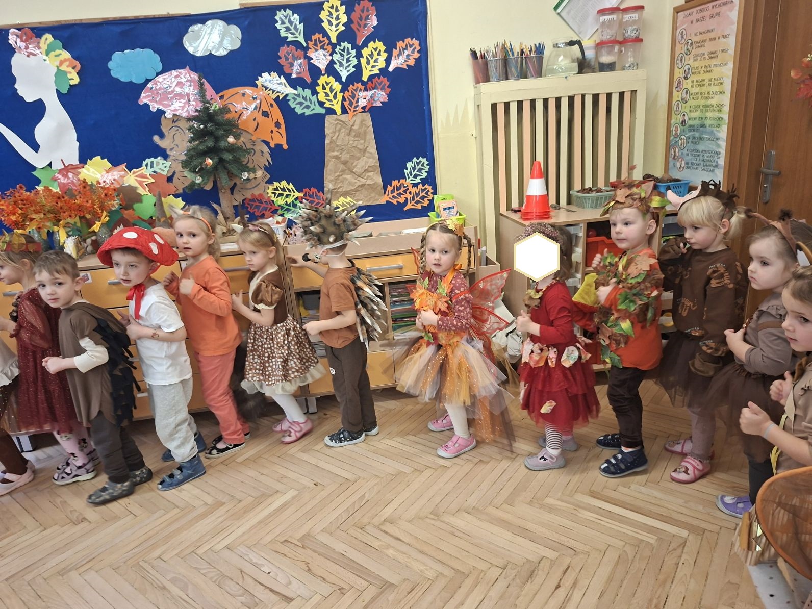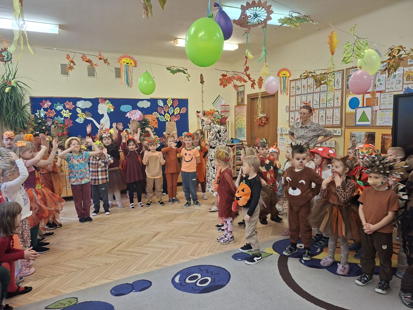 Przedszkolaki przebrane w różnorodne, jesienne stroje: grzybki, liście, dynie, panie jesień, jeżyki, kasztanki, itp. bawiły się przy jesiennych piosenkach. Brały też udział w różnych pląsach, korowodach, konkursach, rozwiązywały jesienne zagadki. Na koniec każda z grup zaprezentowała swoje stroje poruszajac się w jesiennym pociągu.