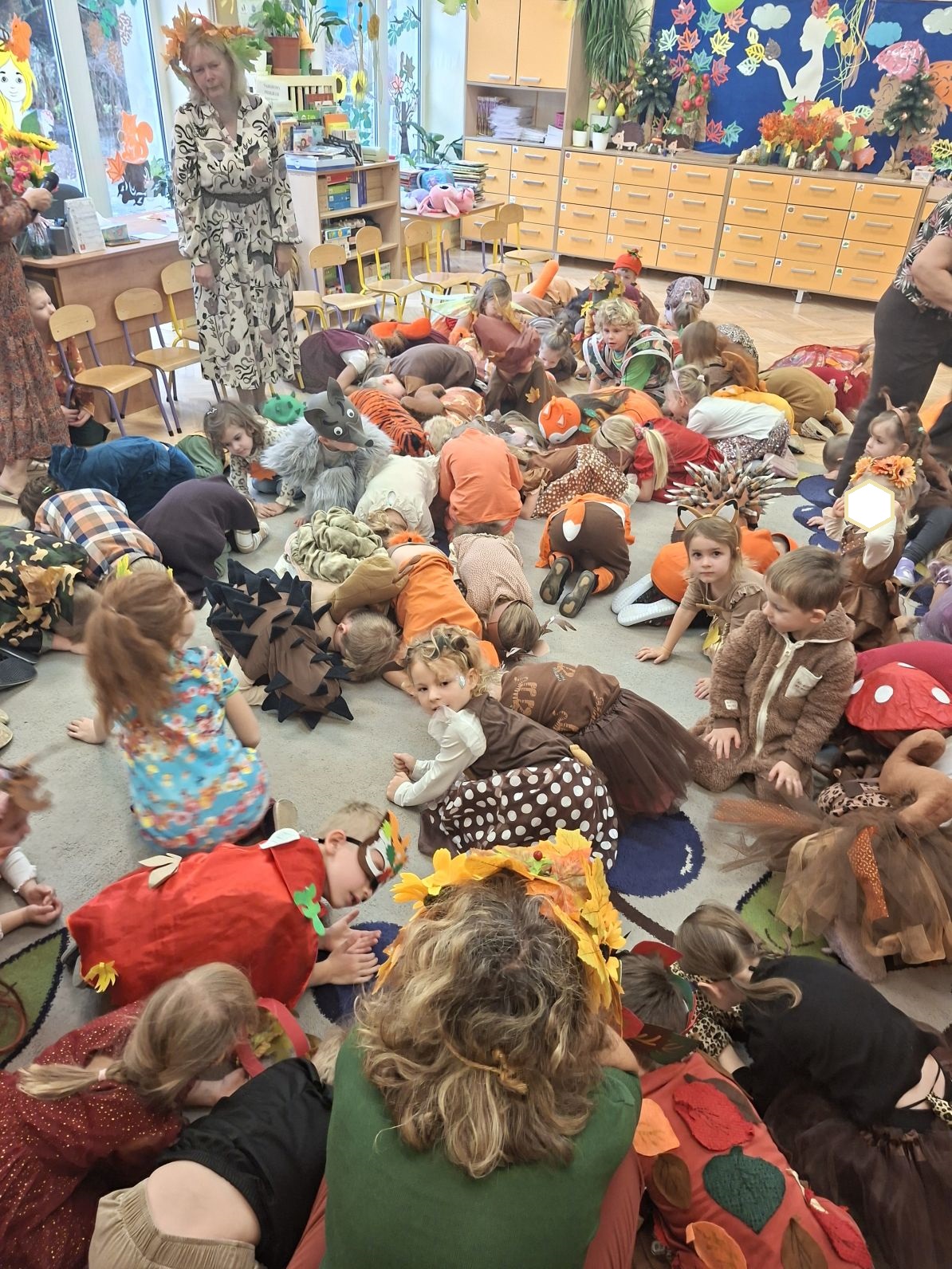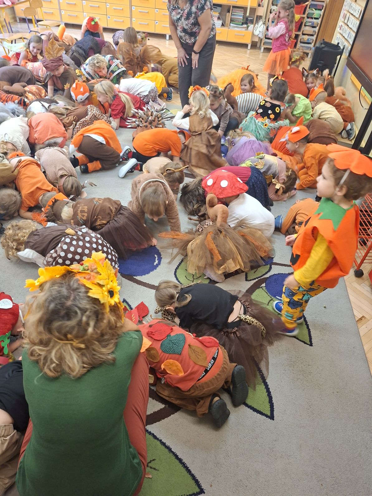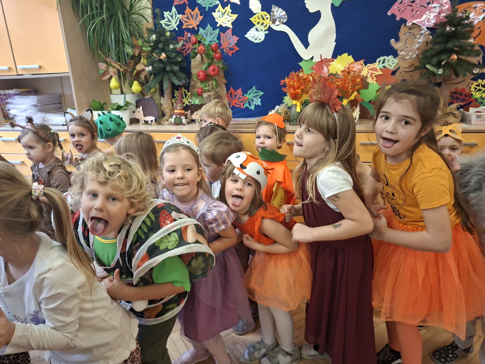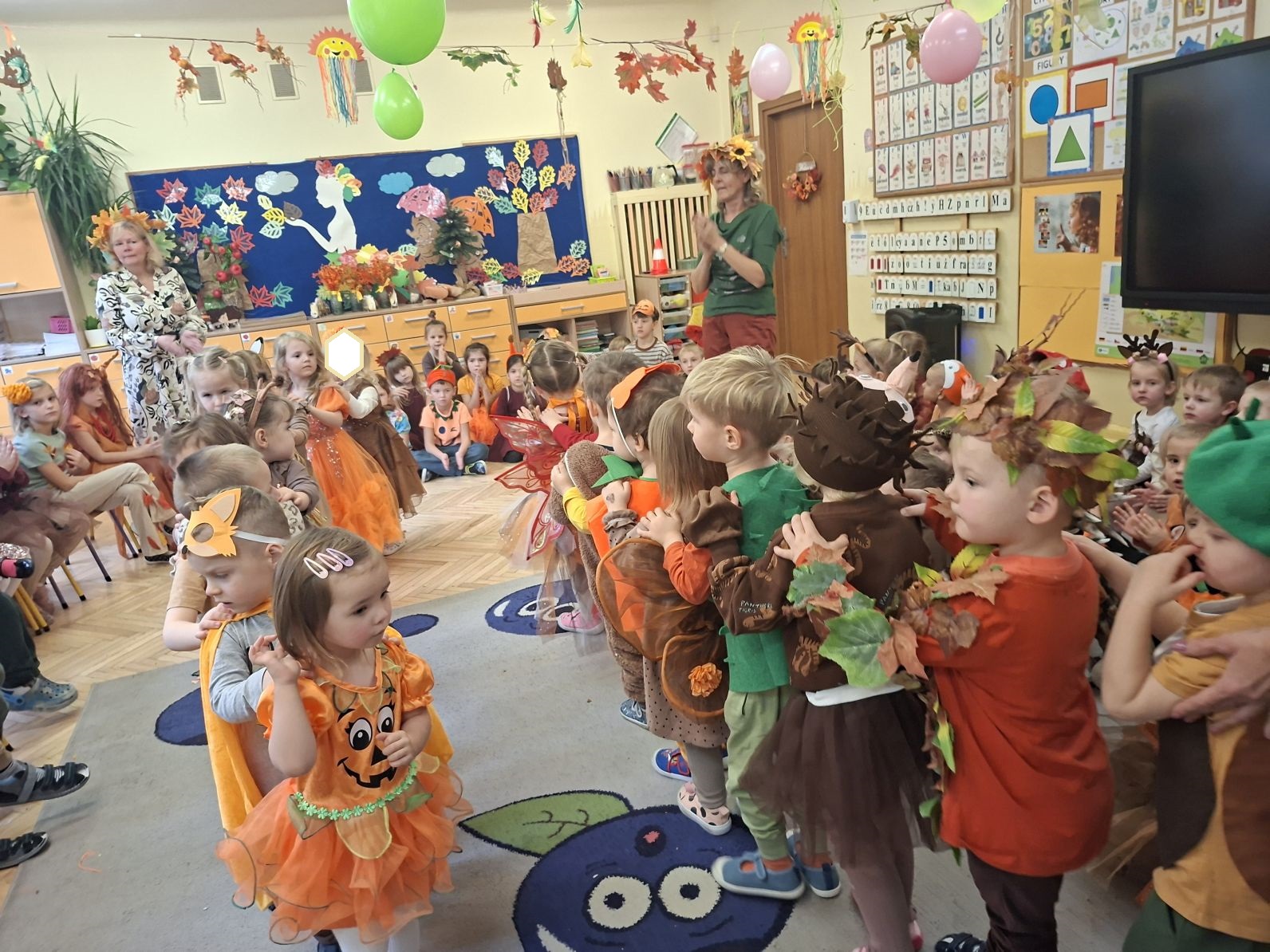 Przedszkolaki przebrane w różnorodne, jesienne stroje: grzybki, liście, dynie, panie jesień, jeżyki, kasztanki, itp. bawiły się przy jesiennych piosenkach. Brały też udział w różnych pląsach, korowodach, konkursach, rozwiązywały jesienne zagadki. Na koniec każda z grup zaprezentowała swoje stroje poruszajac się w jesiennym pociągu.