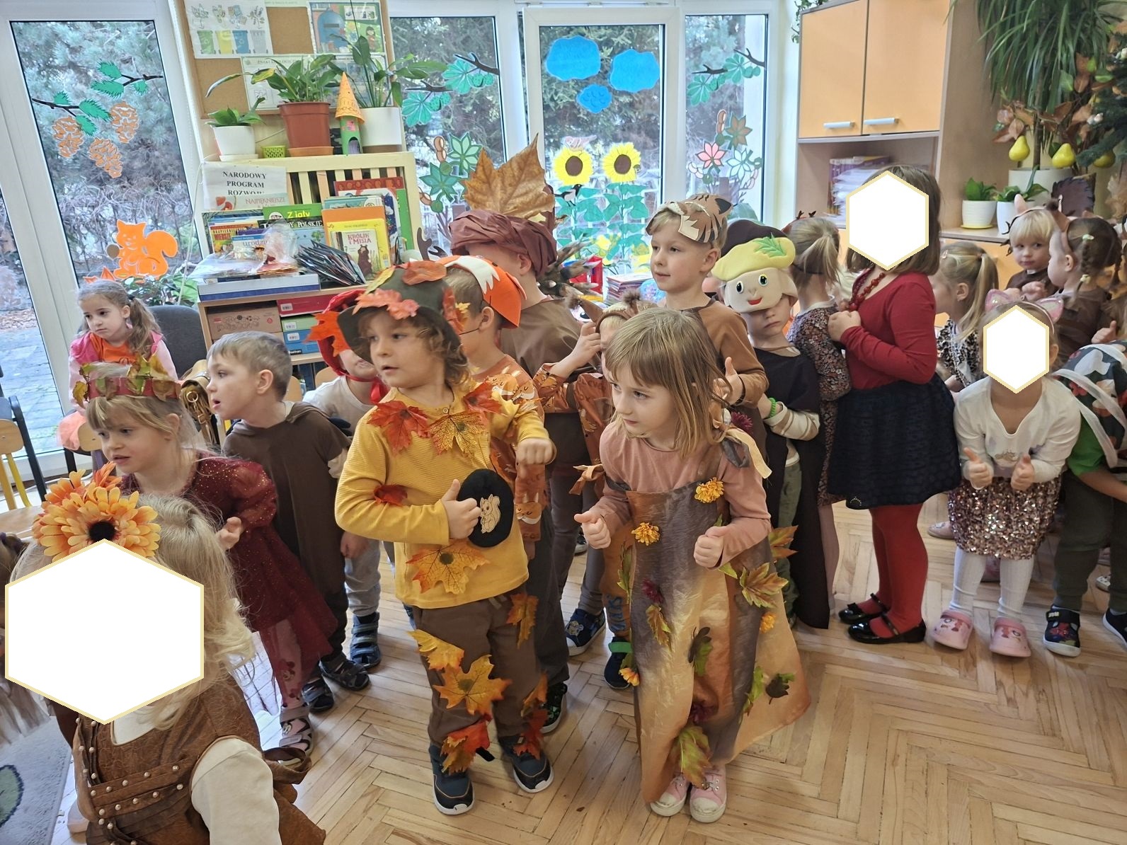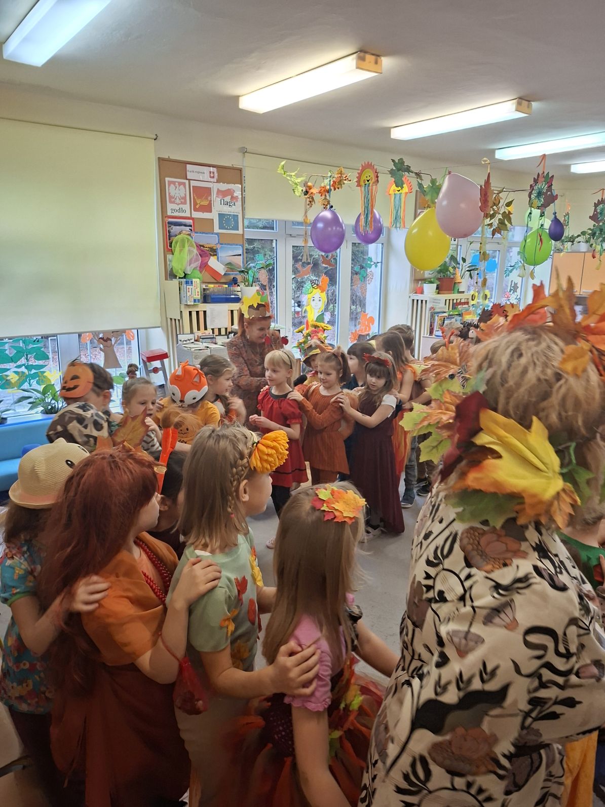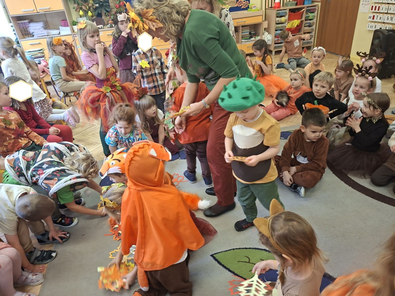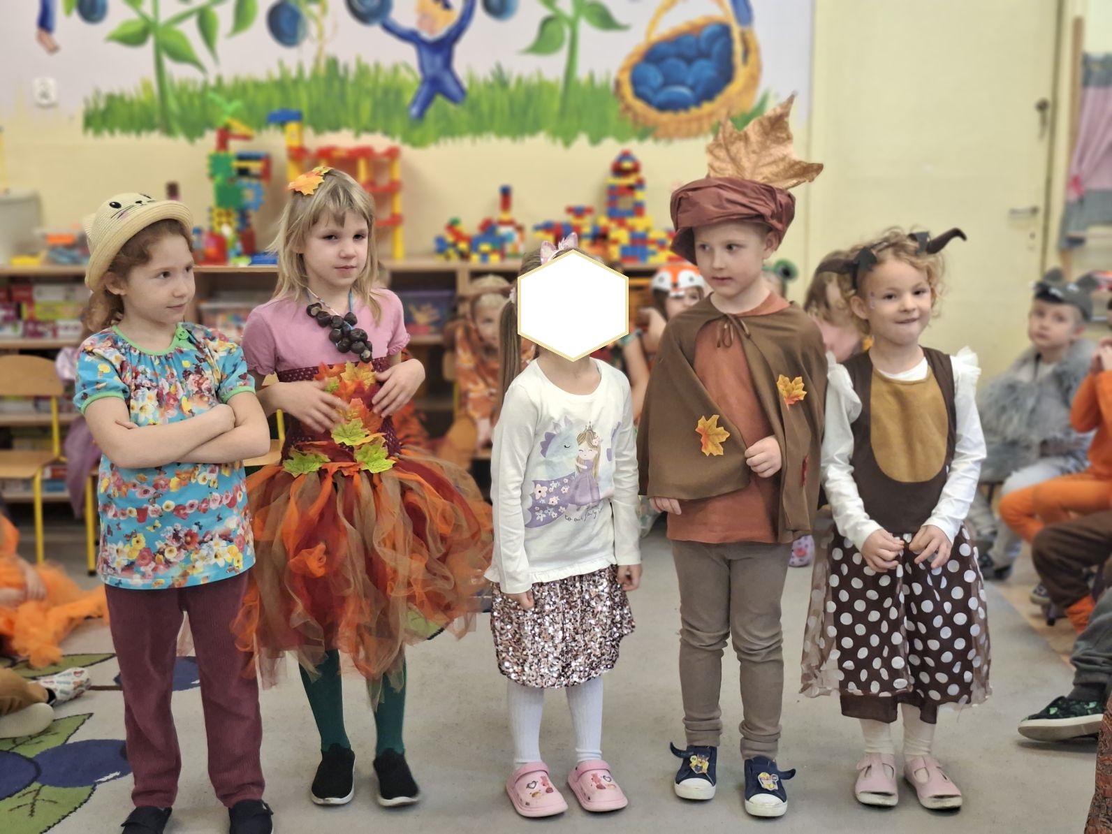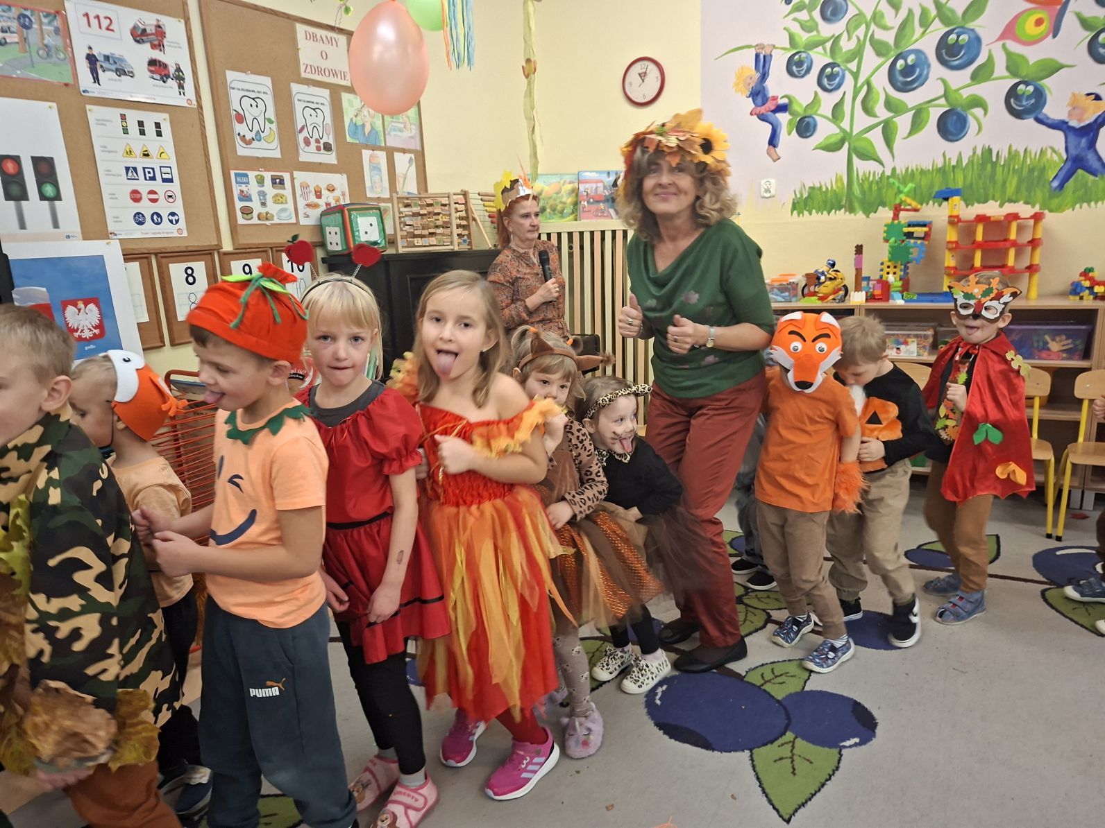 Przedszkolaki przebrane w różnorodne, jesienne stroje: grzybki, liście, dynie, panie jesień, jeżyki, kasztanki, itp. bawiły się przy jesiennych piosenkach. Brały też udział w różnych pląsach, korowodach, konkursach, rozwiązywały jesienne zagadki. Na koniec każda z grup zaprezentowała swoje stroje poruszajac się w jesiennym pociągu.