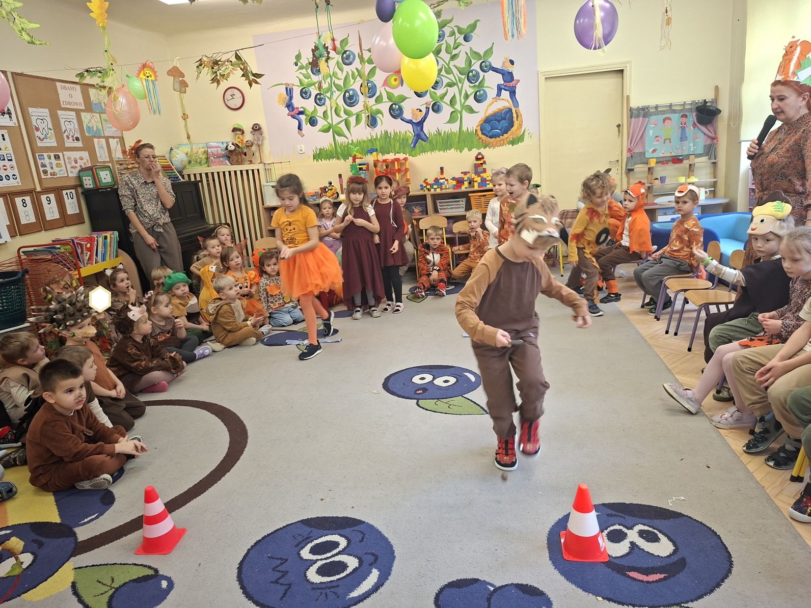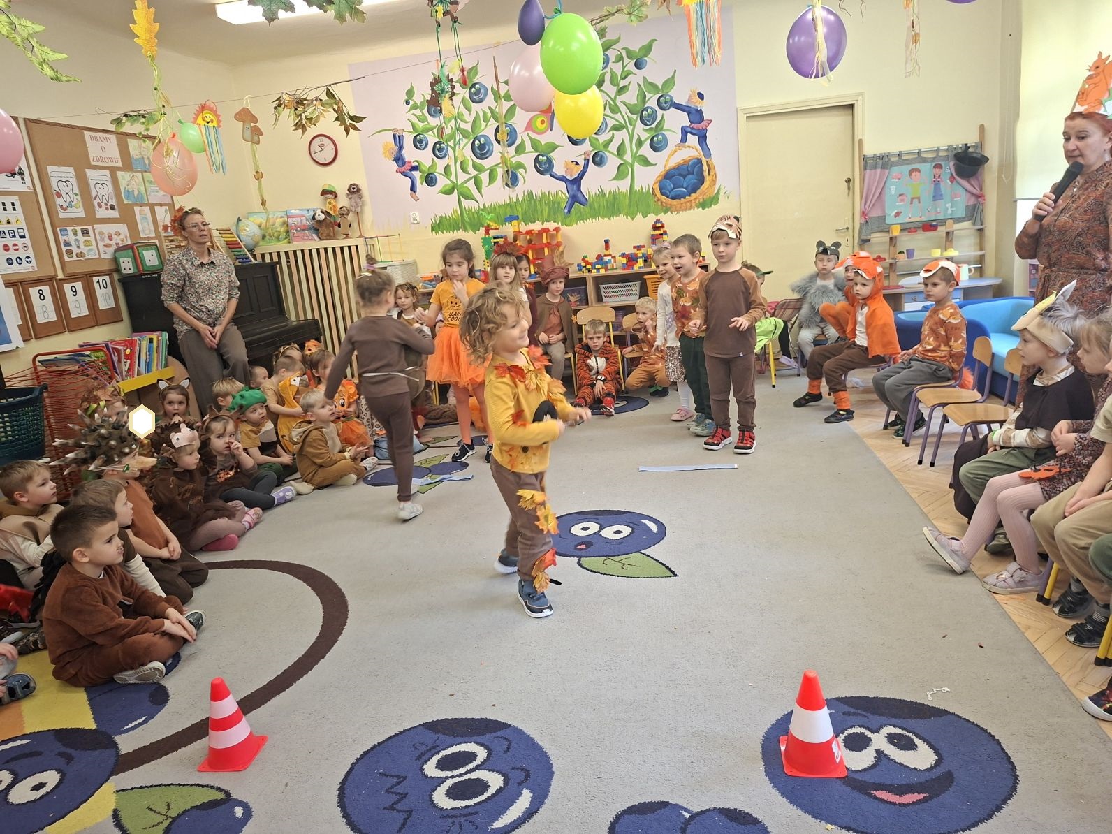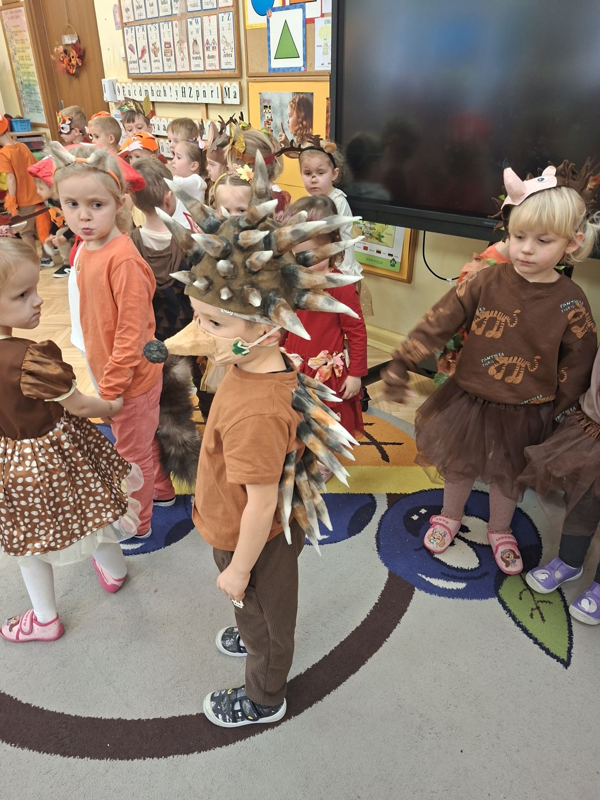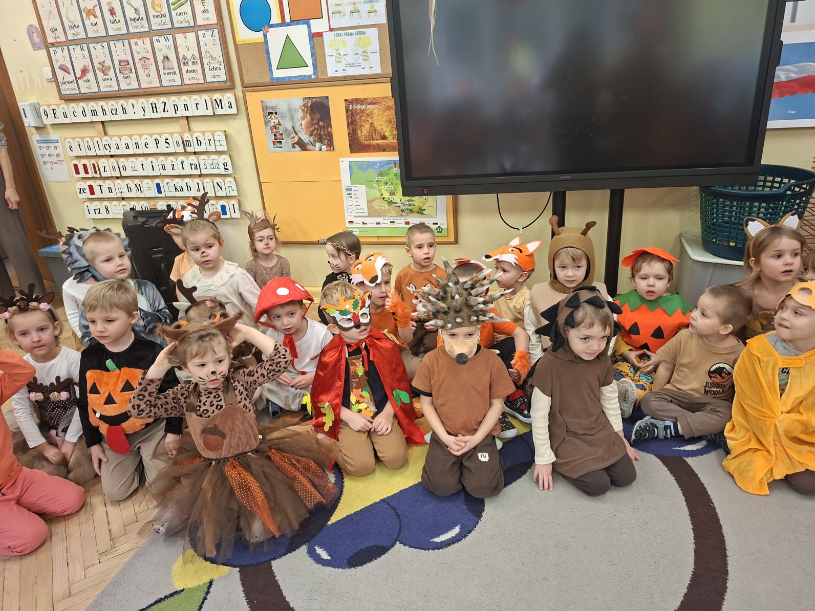 Przedszkolaki przebrane w różnorodne, jesienne stroje: grzybki, liście, dynie, panie jesień, jeżyki, kasztanki, itp. bawiły się przy jesiennych piosenkach. Brały też udział w różnych pląsach, korowodach, konkursach, rozwiązywały jesienne zagadki. Na koniec każda z grup zaprezentowała swoje stroje poruszajac się w jesiennym pociągu.