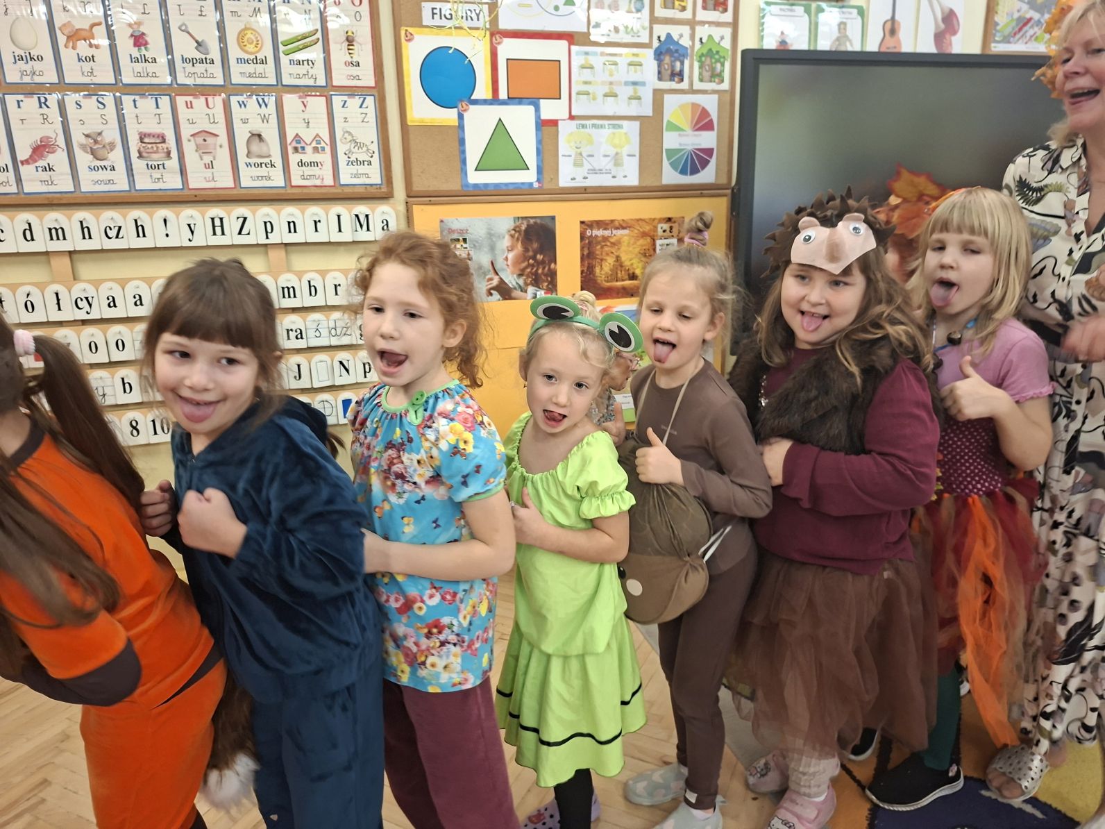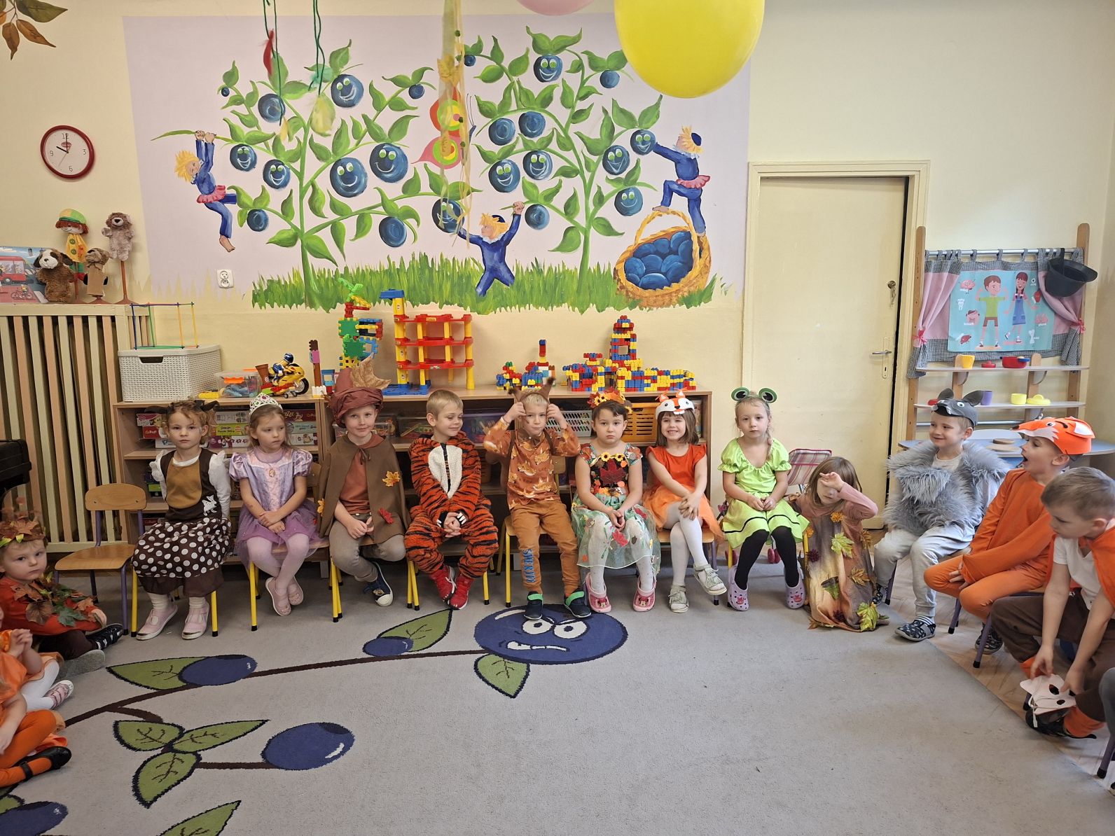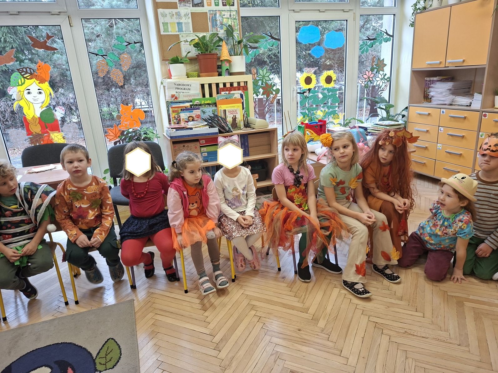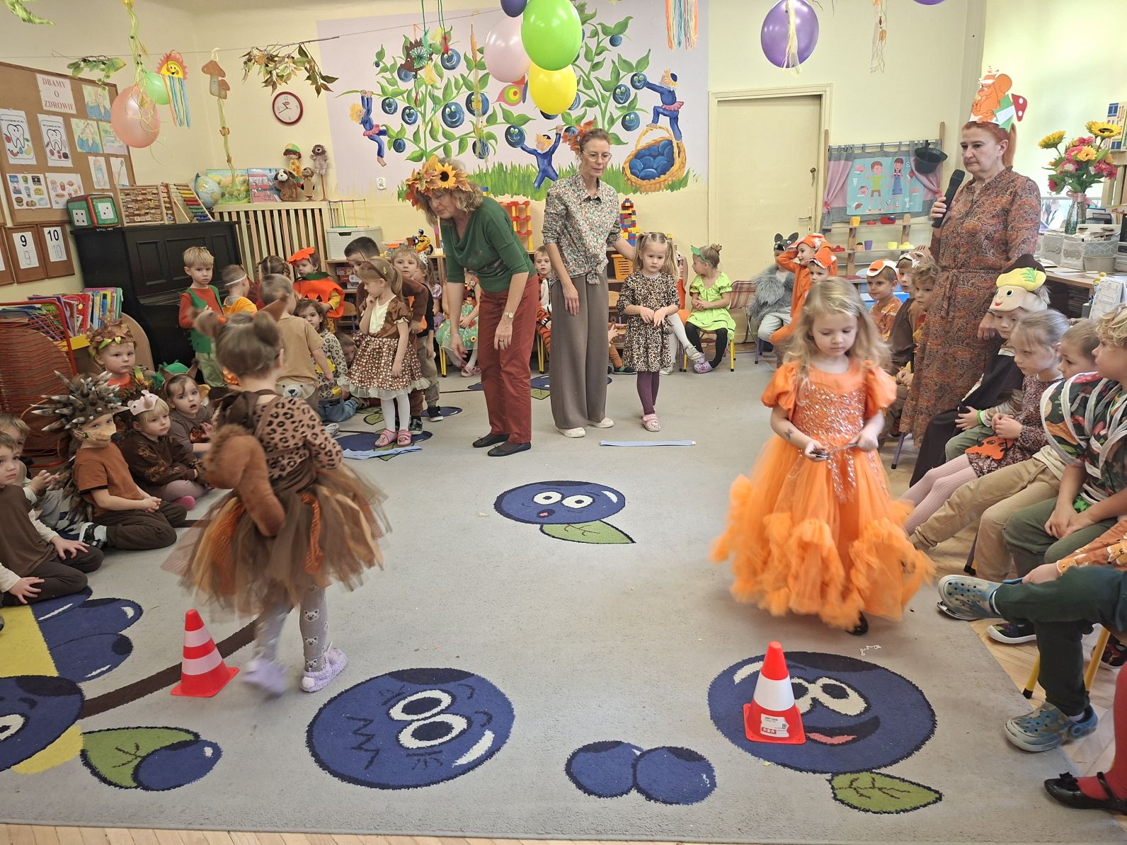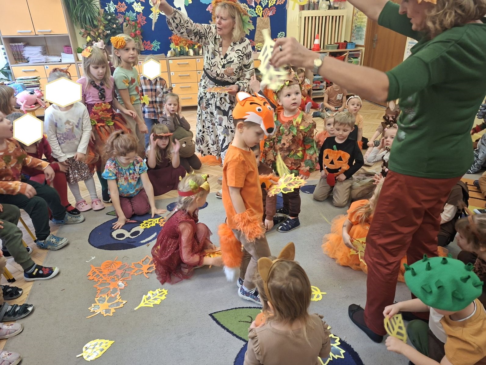 Przedszkolaki przebrane w różnorodne, jesienne stroje: grzybki, liście, dynie, panie jesień, jeżyki, kasztanki, itp. bawiły się przy jesiennych piosenkach. Brały też udział w różnych pląsach, korowodach, konkursach, rozwiązywały jesienne zagadki. Na koniec każda z grup zaprezentowała swoje stroje poruszajac się w jesiennym pociągu.