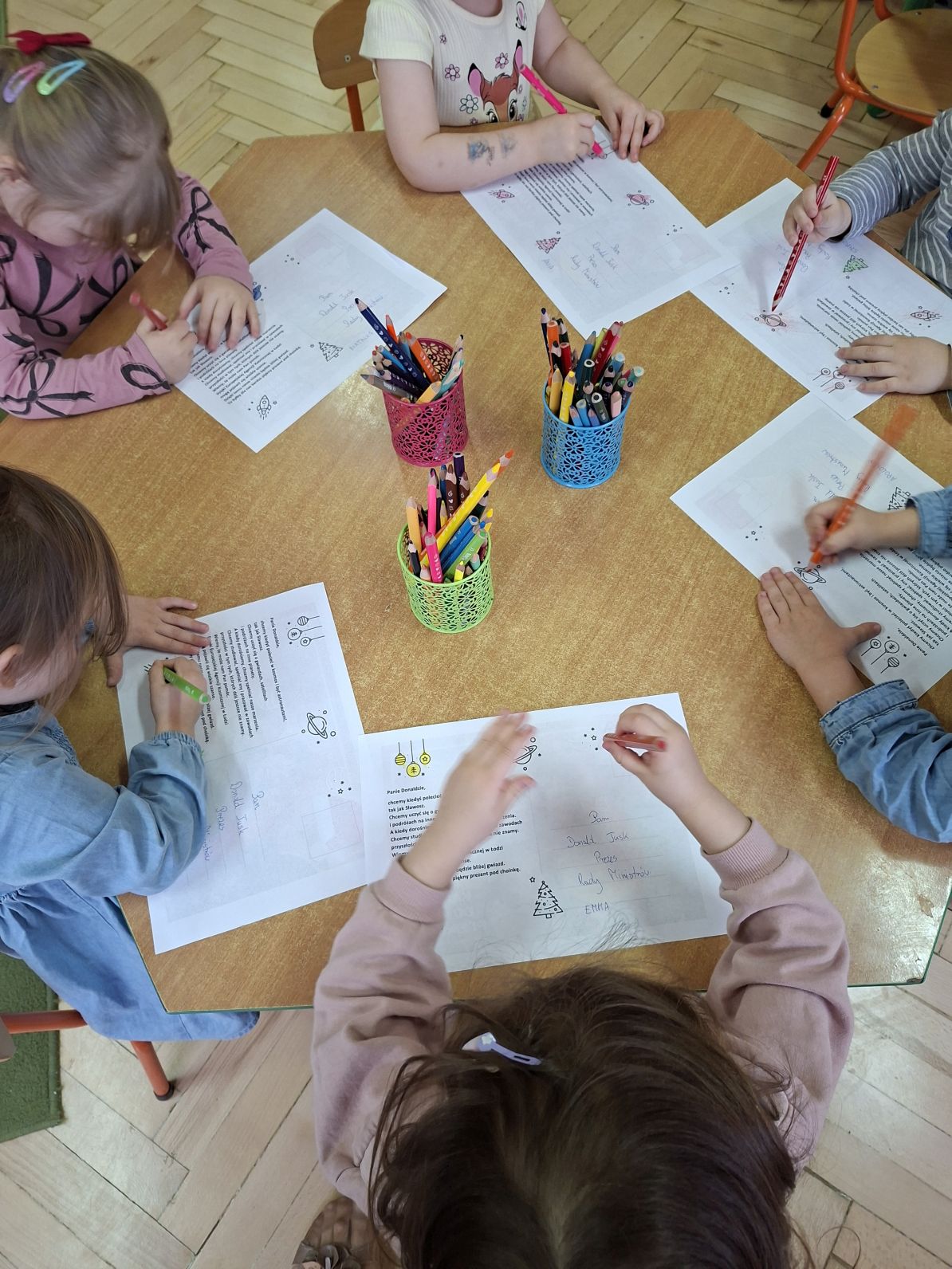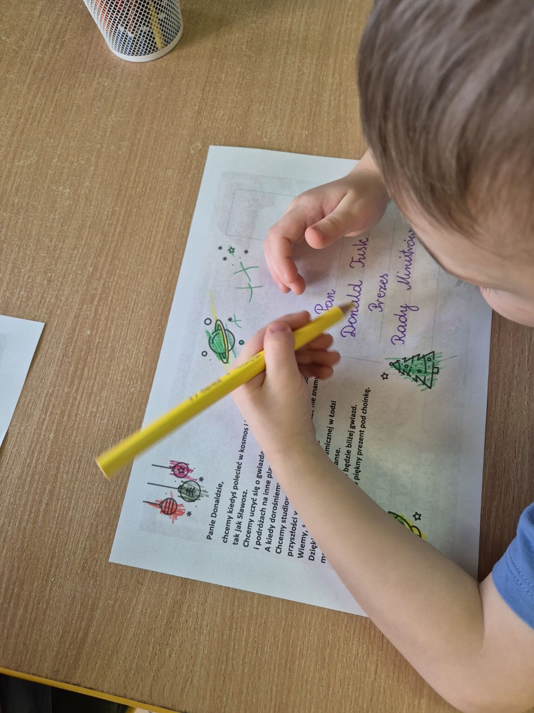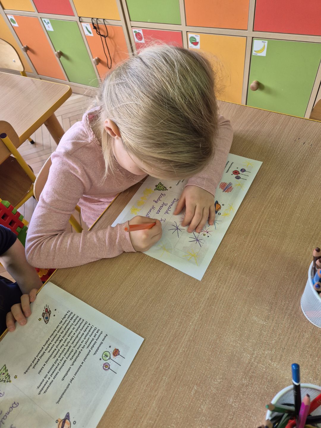 Dzieci z każdej grupy wiekowej kolorowały dedykowaną kartkę z treścią listu, starsze przedszkolaki dorysowywały również swoje obrazki. Następnie podpisane i zaadresowane do pana Premiera kartki zostały zapakowane i wysłane na podany adres do Prezesa Rady Ministrów.