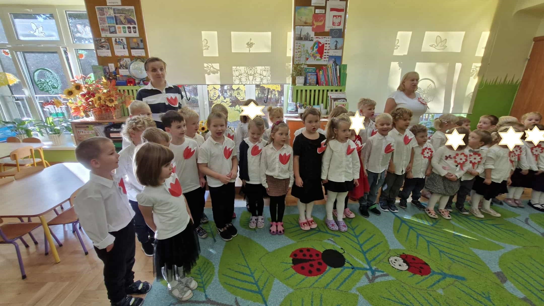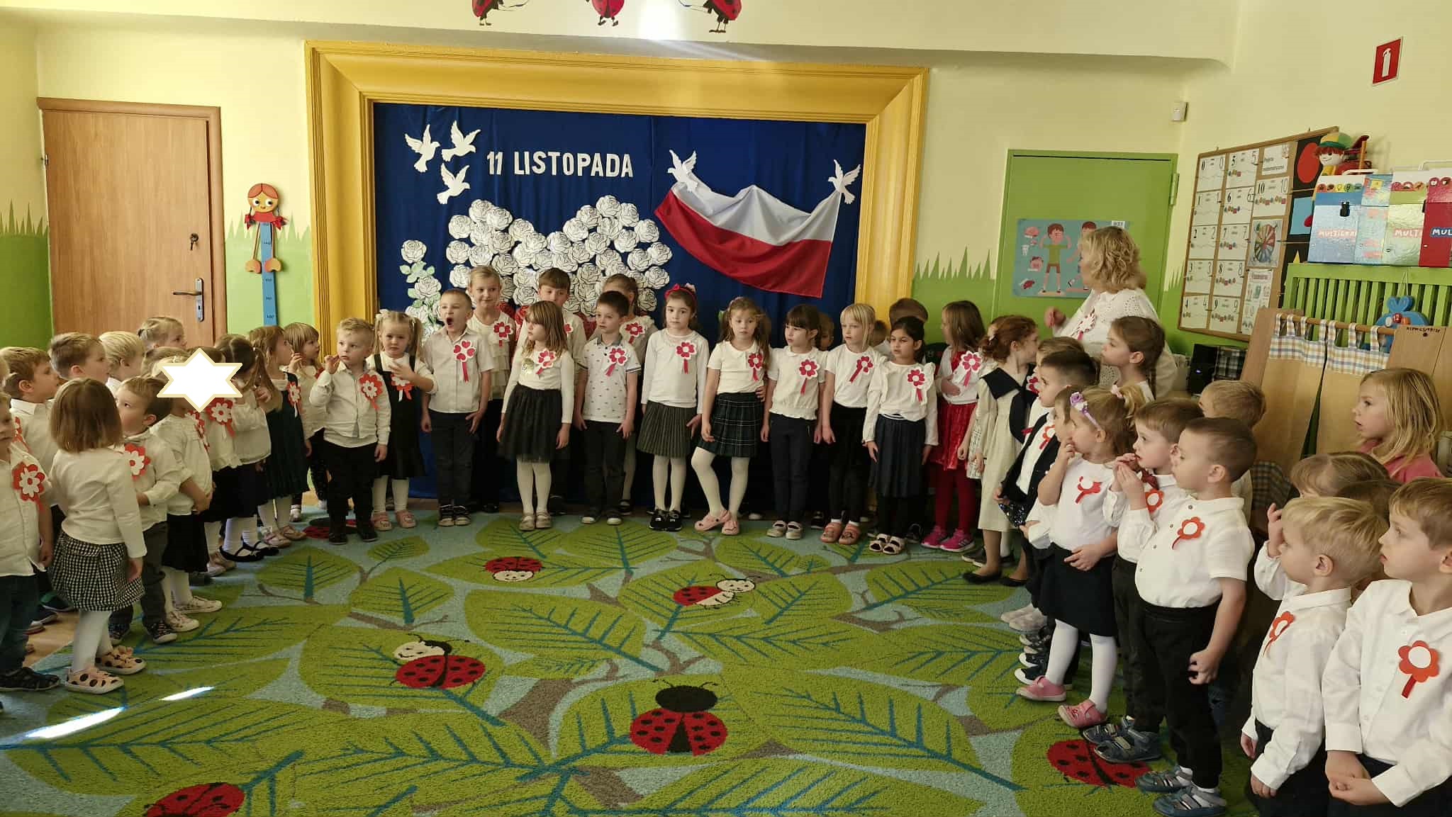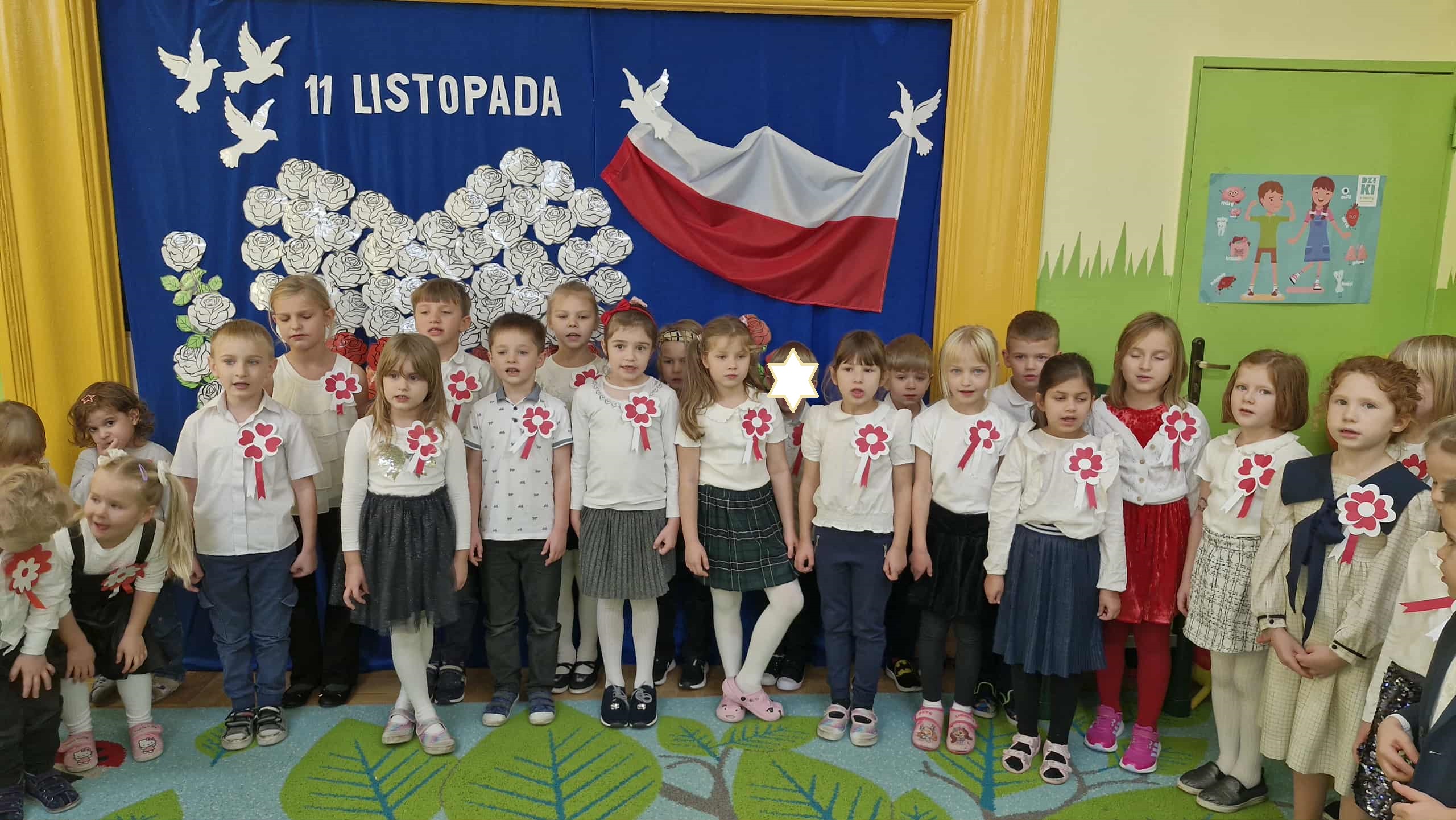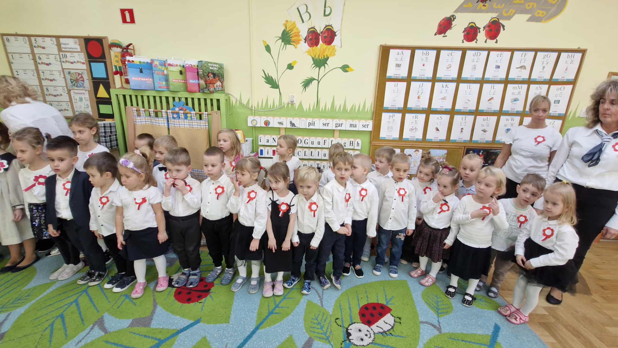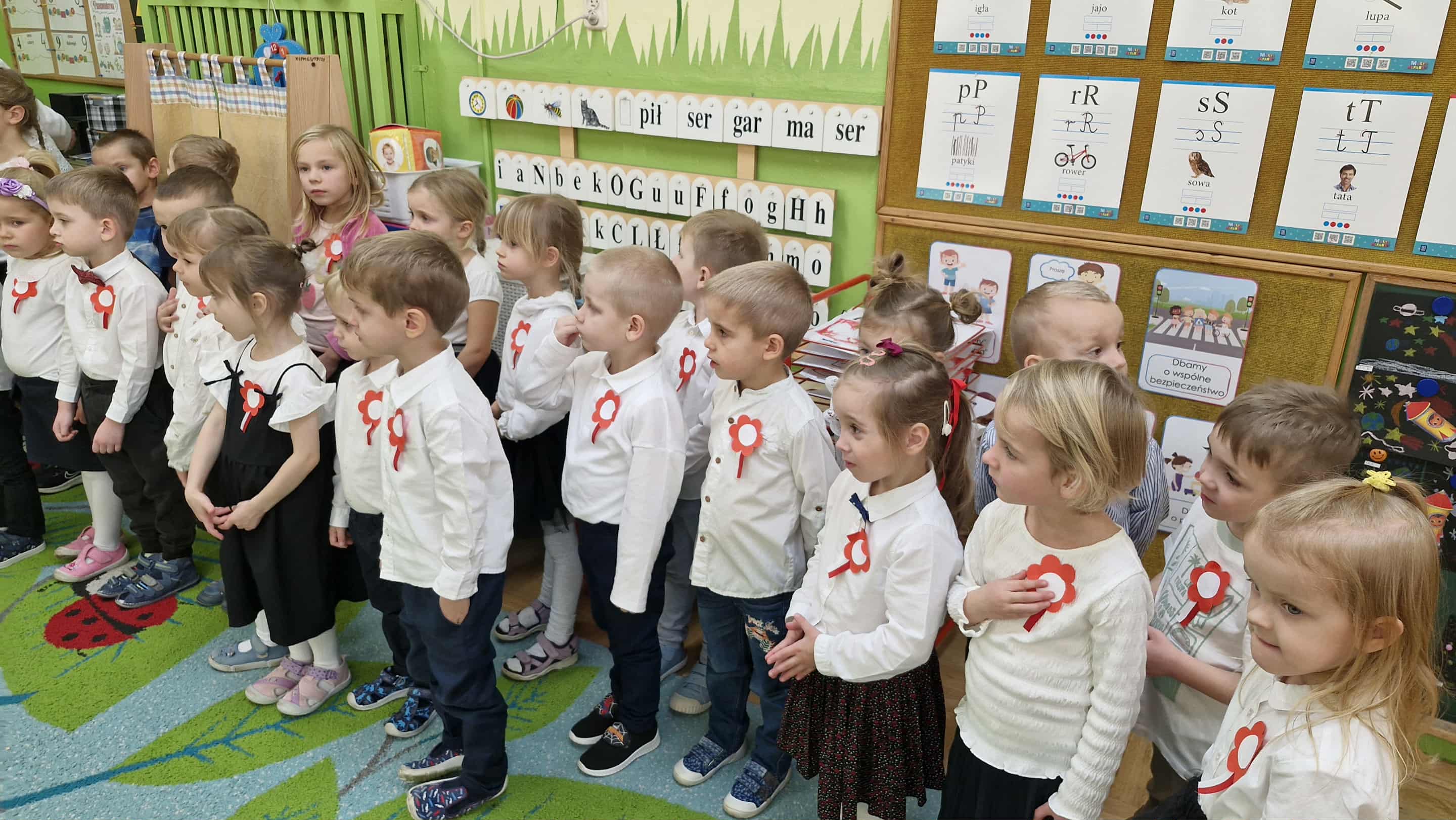 Przedszkolaki wzięły udział w ogólnopolskim śpiewaniu Hymnu Narodowego. Wcześniej odbył się mini quiz wiedzy o tym święcie, a następnie dzieci w strojach galowych, z własnoręcznie wykonaną kokardą narodową (kotylionem) na piersi odśpiewały Mazurka Dąbrowskiego.