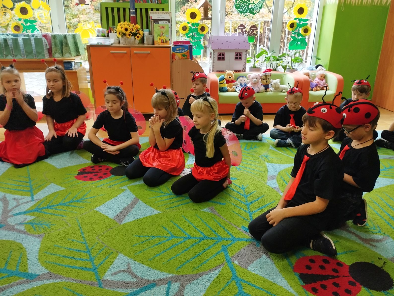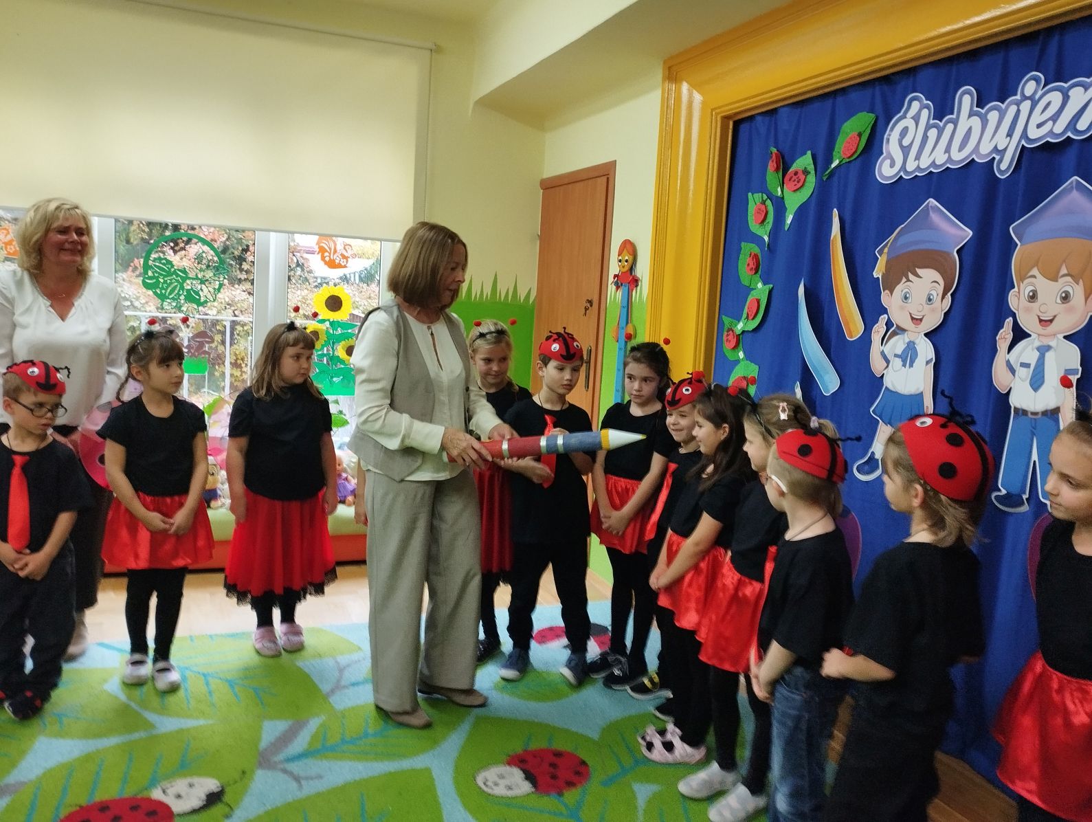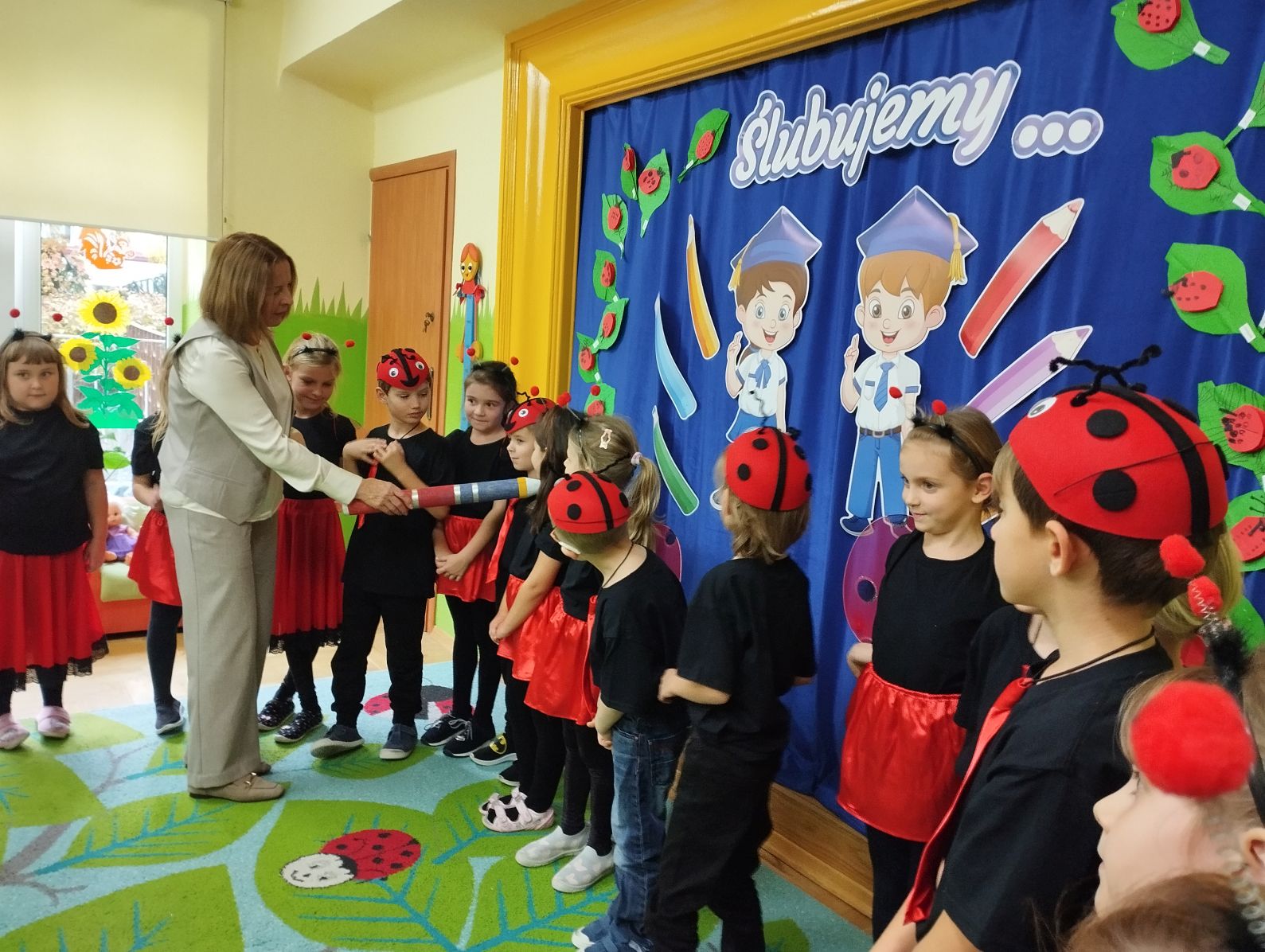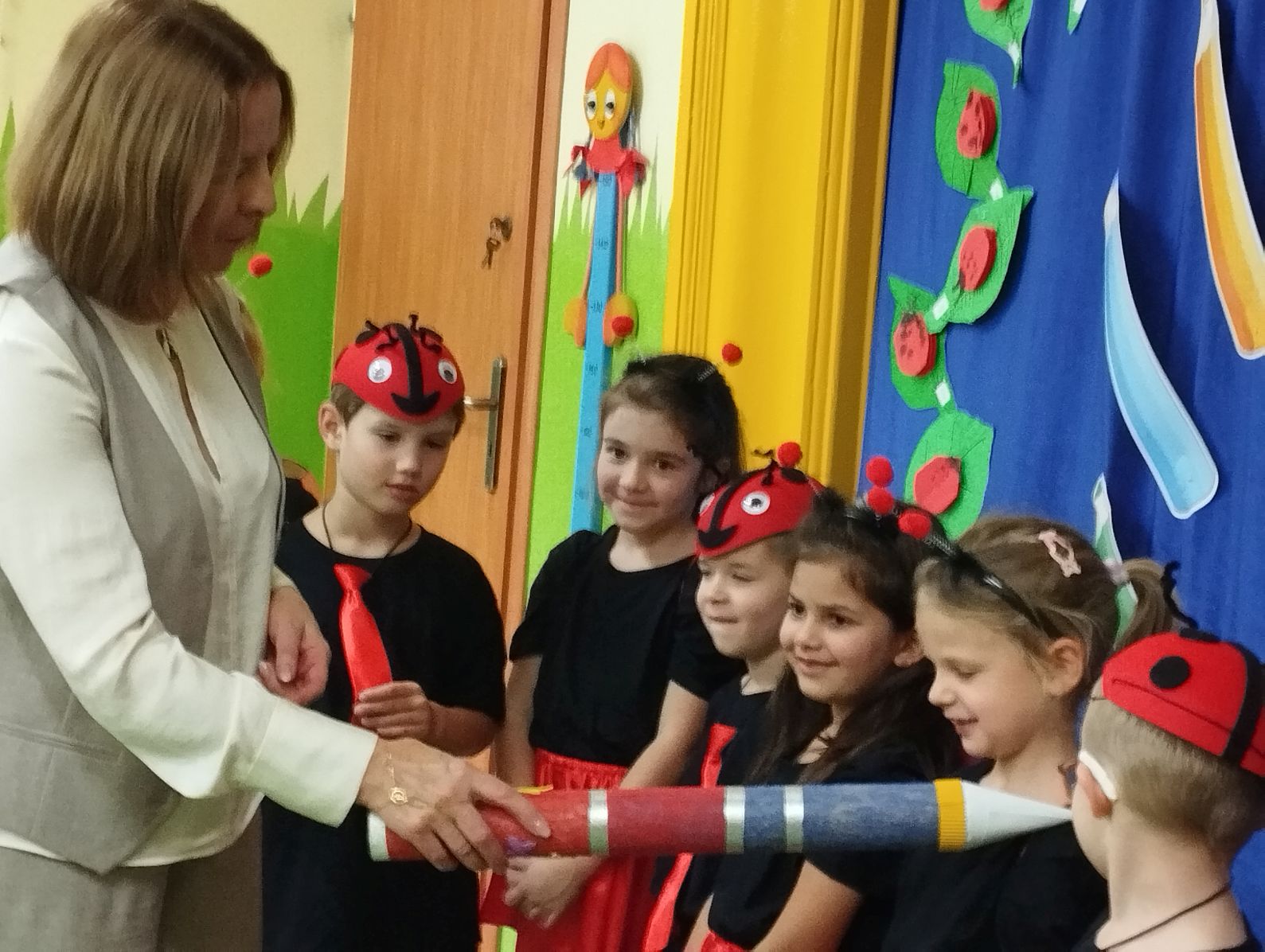 Dzieci przebrane za "biedronki" zaprezentowały rodzicom montaż słowno - muzyczny: recytowały wierszyki, śpiewały pioseni oraz zaprezentowały układ taneczny. Po przedstawieniu zostały pasowane magicznym ołówkiem przez panią dyrektor na przedszkolaka w grupie "Biedronek".