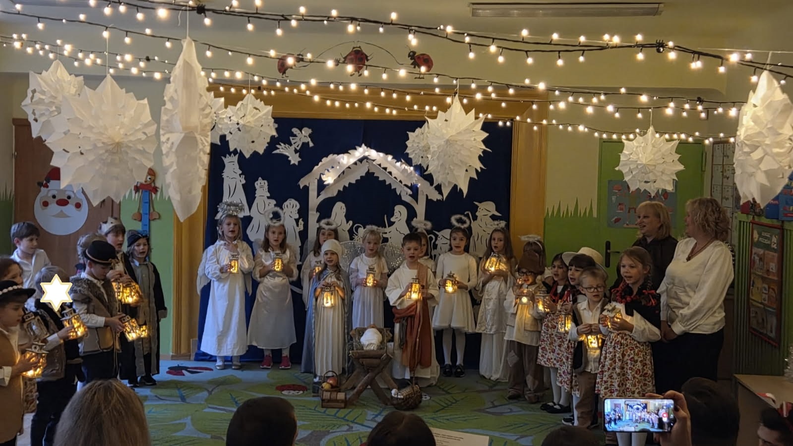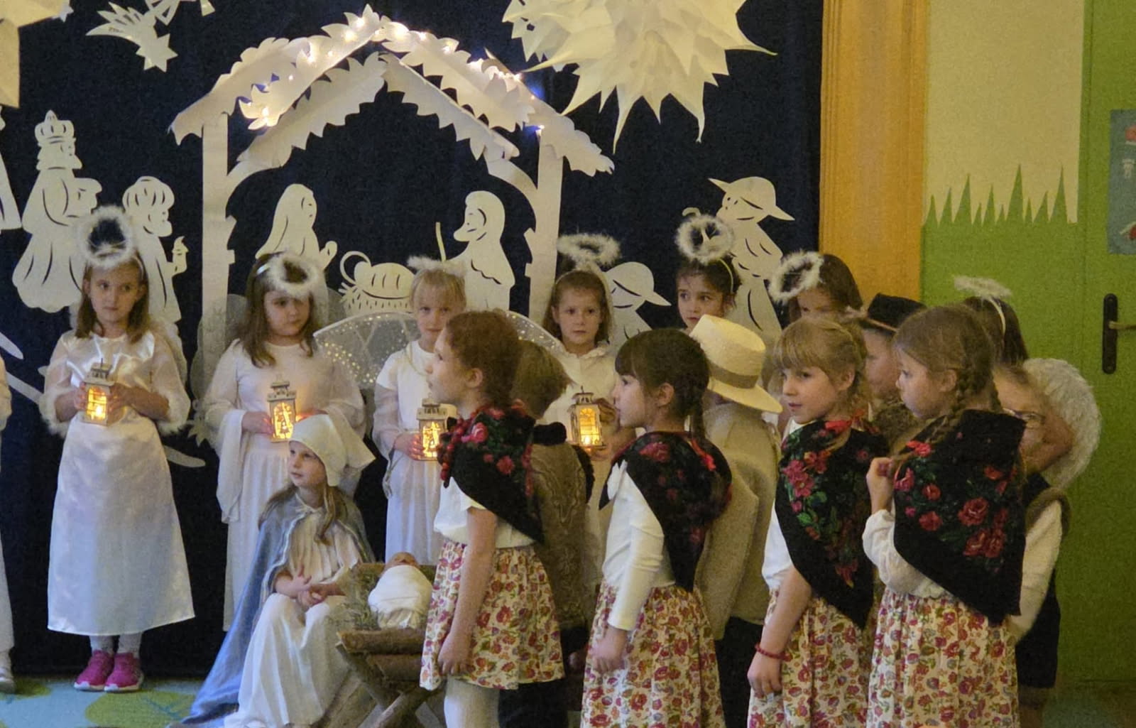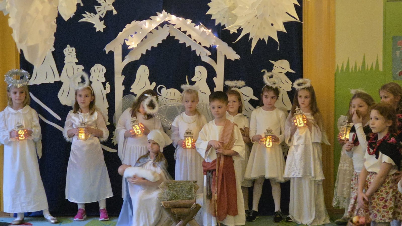 Przedszkolaki zaprezentowały przybyłym gościom "Jasełka". Recytowały wiersze, śpiewały piosenki o tematyce świątecznej oraz kolędy, zaprezentowały również taniec z latarenkami. Po przedstawieniu obdarowały swoich bliskich własnoręcznie wykonanymi upominkami oraz same otrzymały drobne niespodzianki.