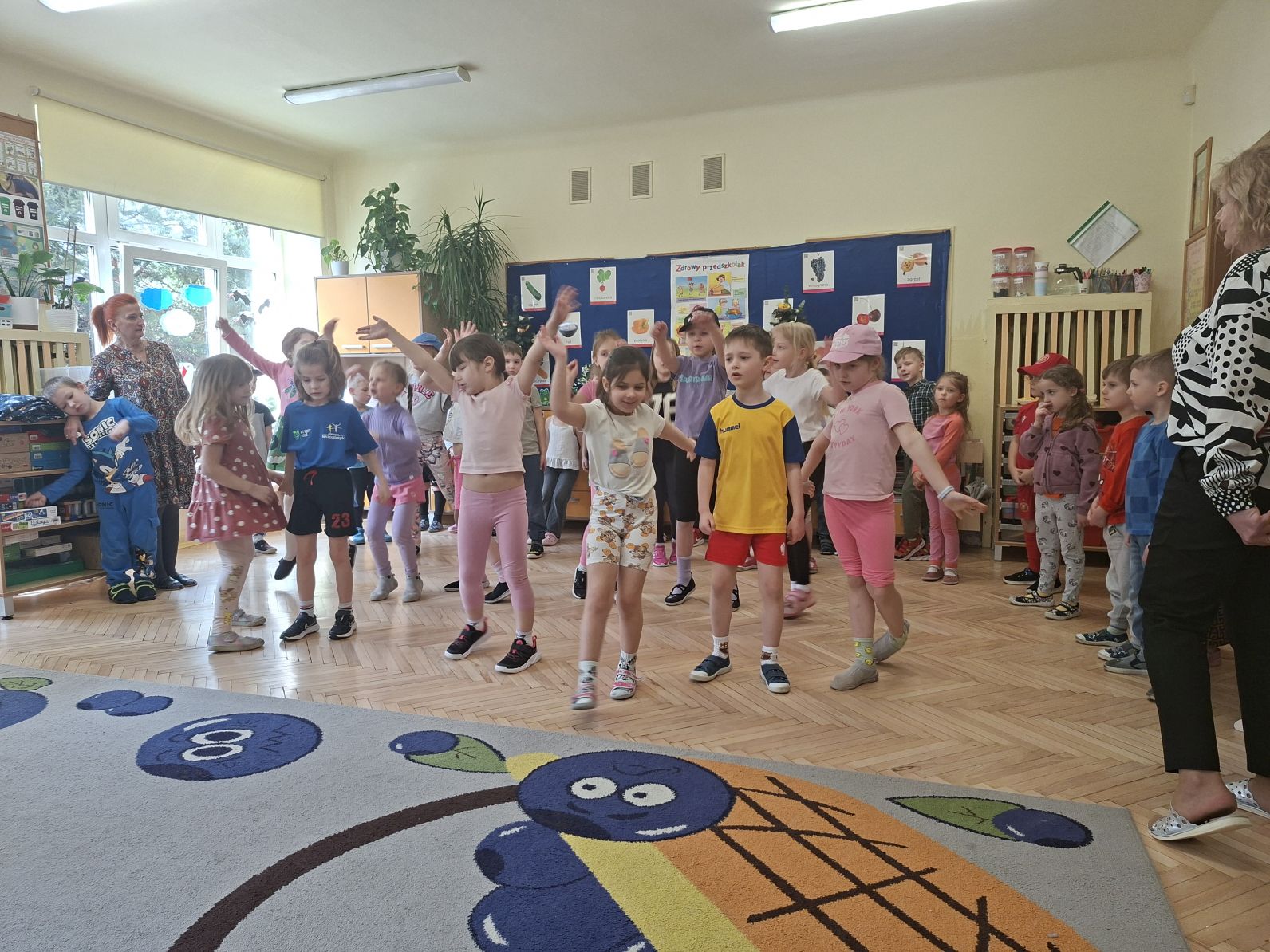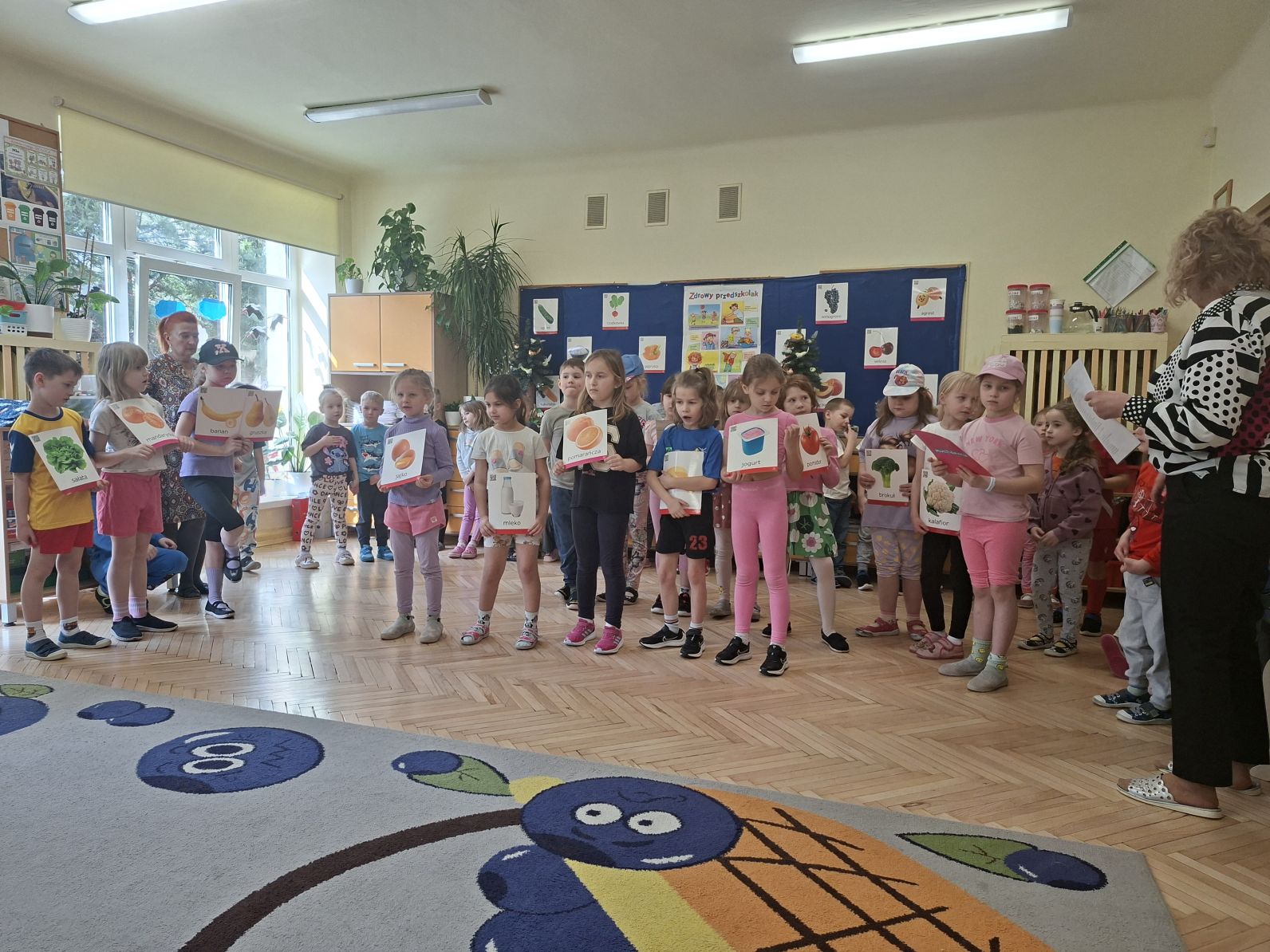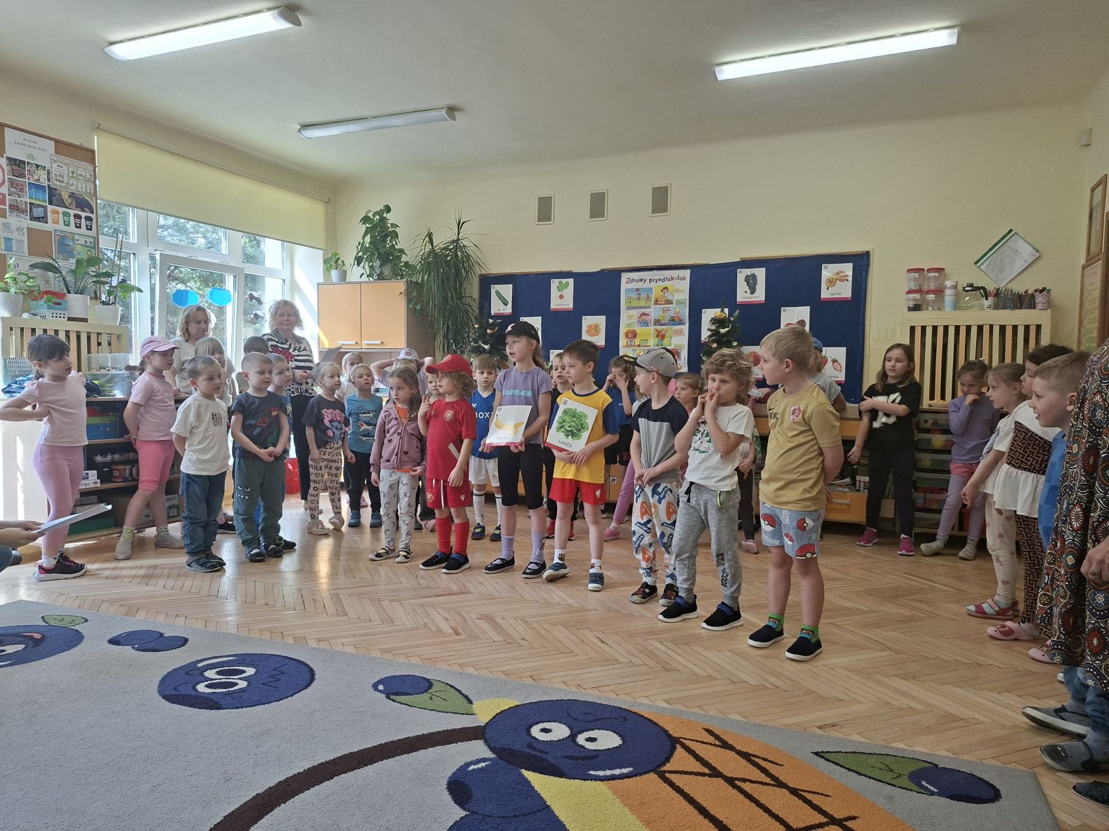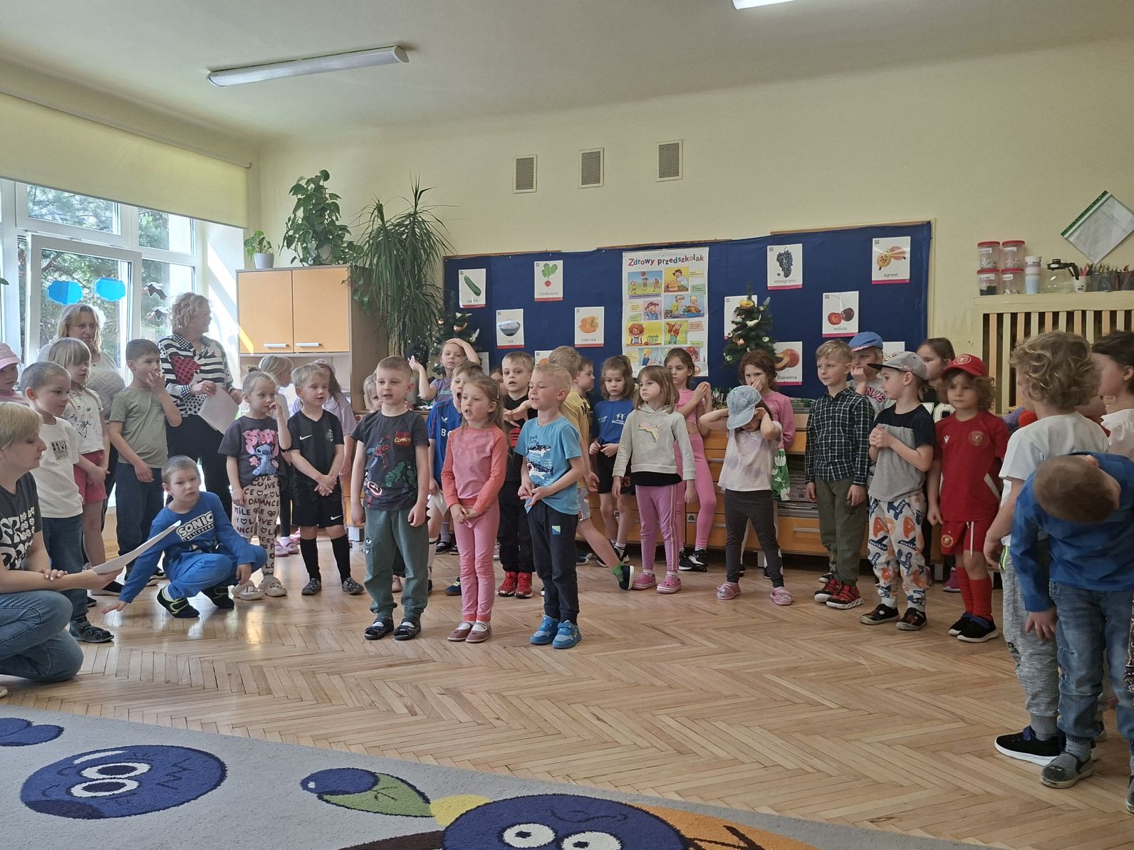 Montaż słowno - muzyczno - taneczny pod w/w tytułem przygotowały i zaprezentowały swoim młodszym kolegom z grupy I i II dzieci ze starszych grup - III i IV. Młodsze przedszkolaki na podstawie wierszy i piosenek przygotowanych przez starszych kolegów utrwaliły zasady zdrowego żywienia oraz zdrowego stylu życia, dowiedziały się również, jak ważny dla naszego zdrowia jest ruch, a także dbanie o higienę osobistą.