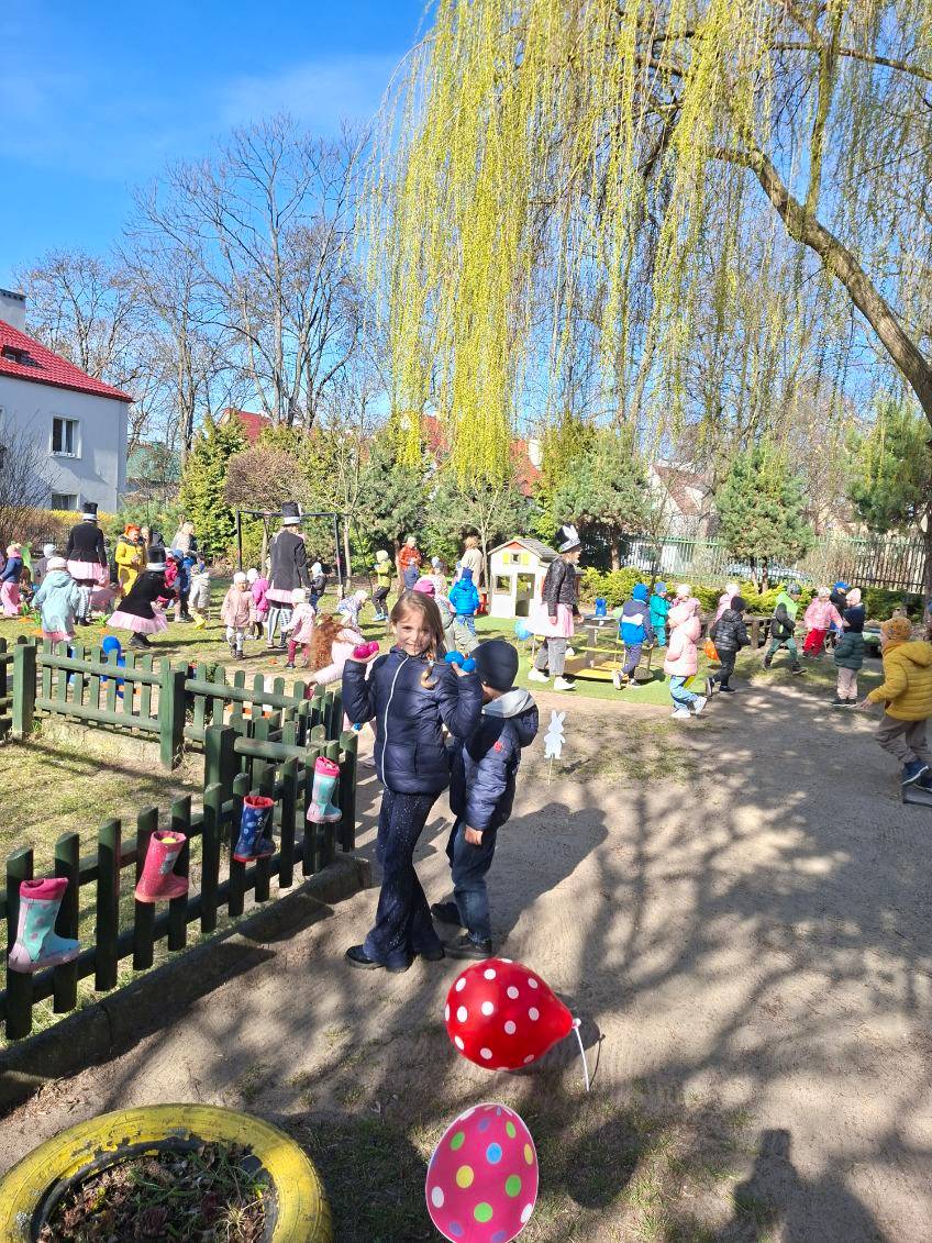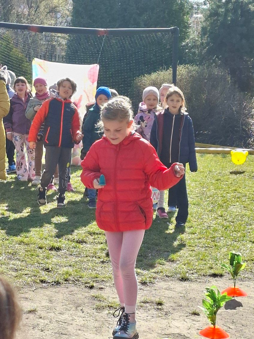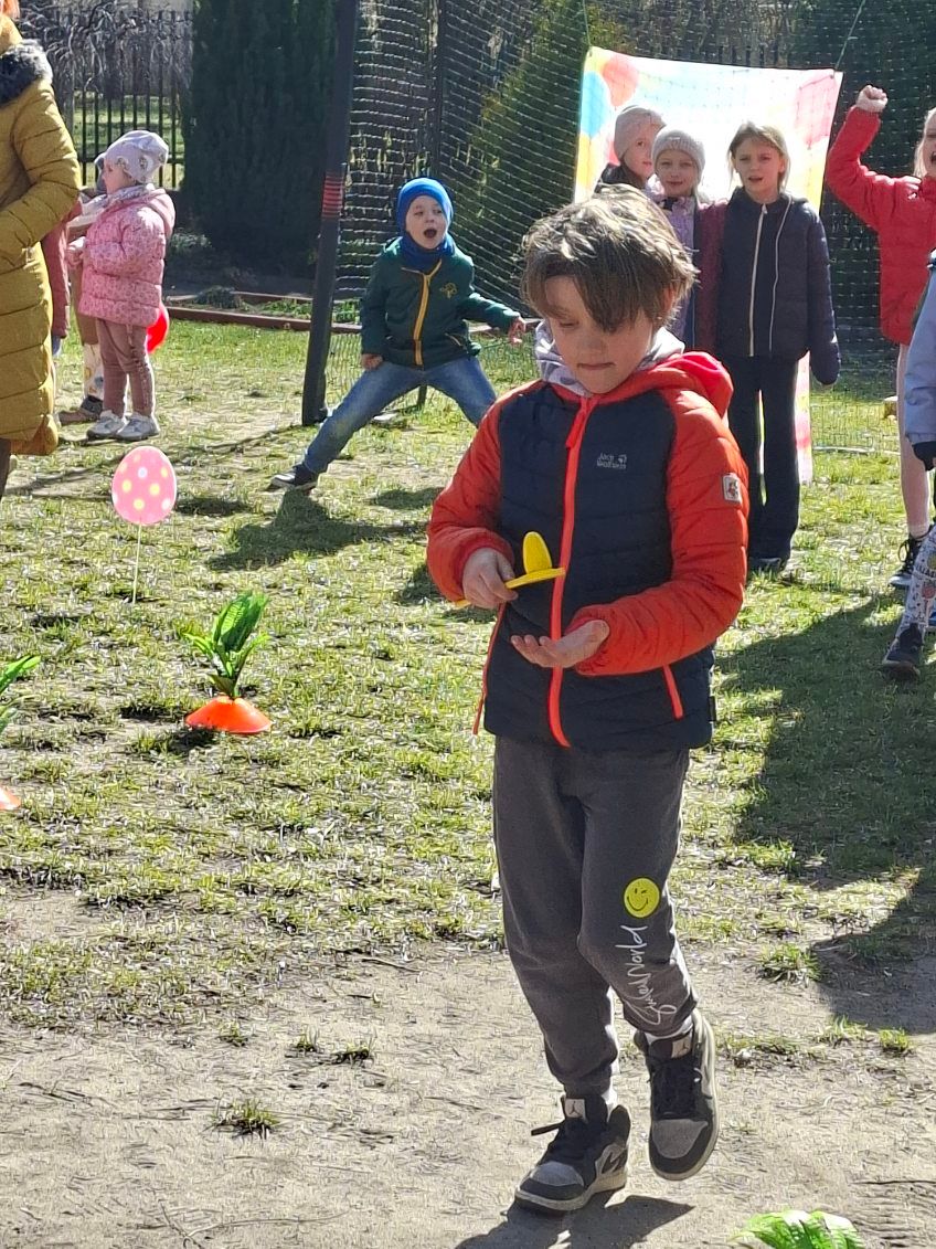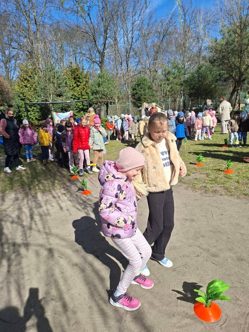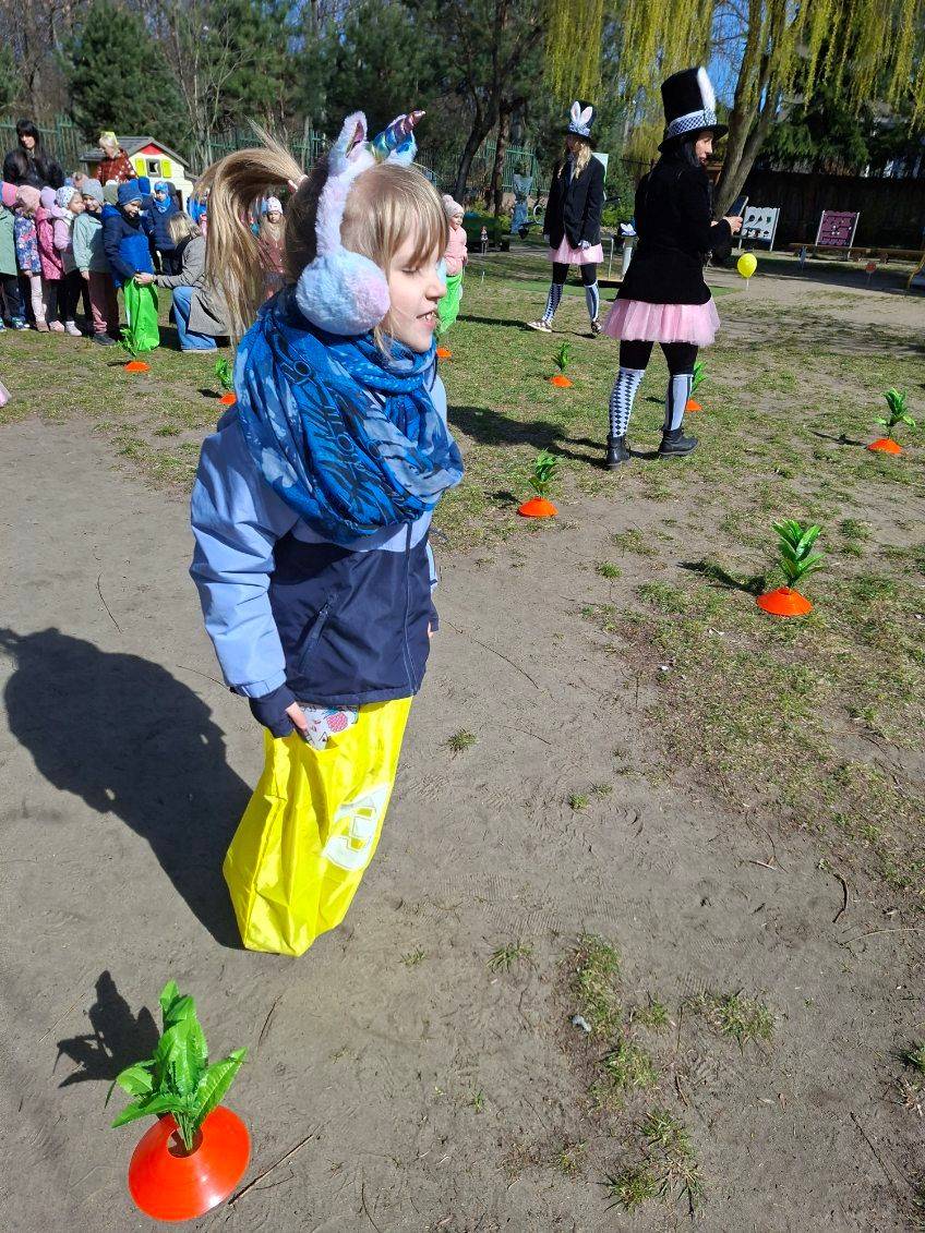 W ramach zajęć dzieci uczestniczyły w różnych zabawach ruchowych  w ogrodzie przedszkolnym, min. takich jak: poszukiwanie jajek w ogrodzie, przenoszenie jajek na łyżkach, skoki w workach slalomem między marchewkami, korowód z zajączkiem.