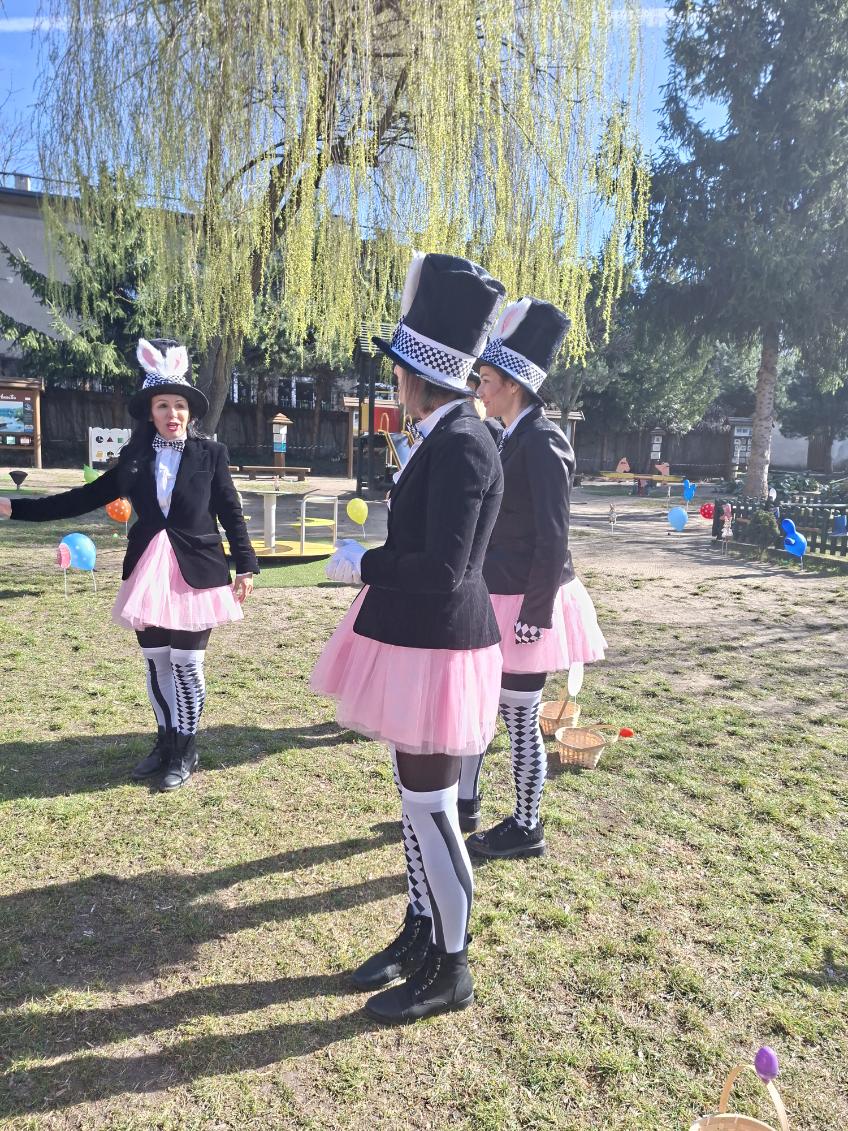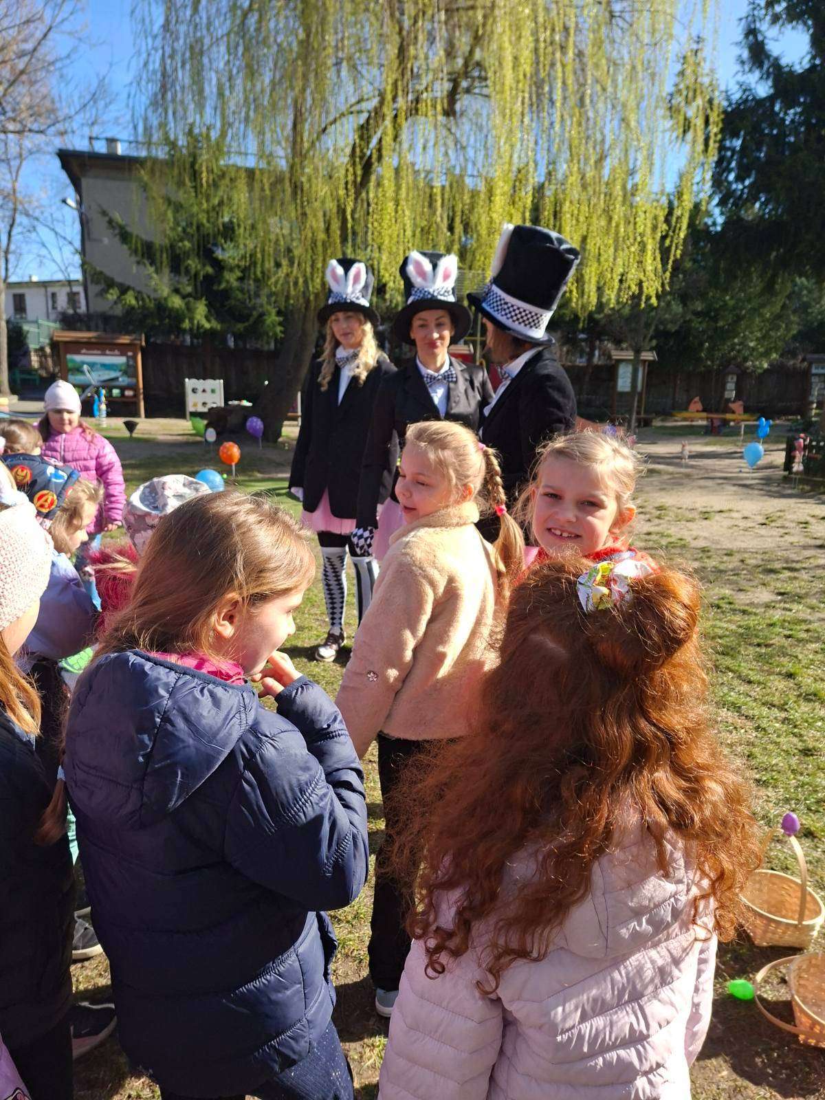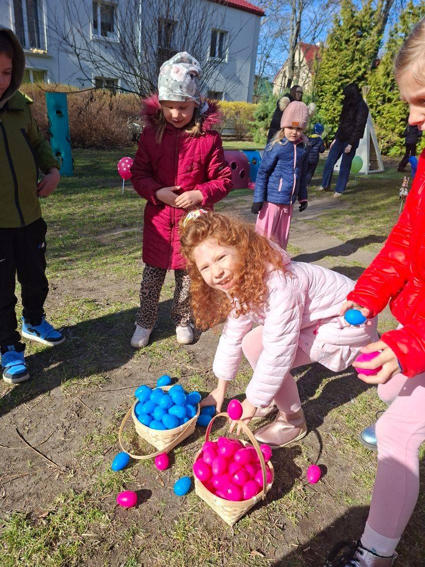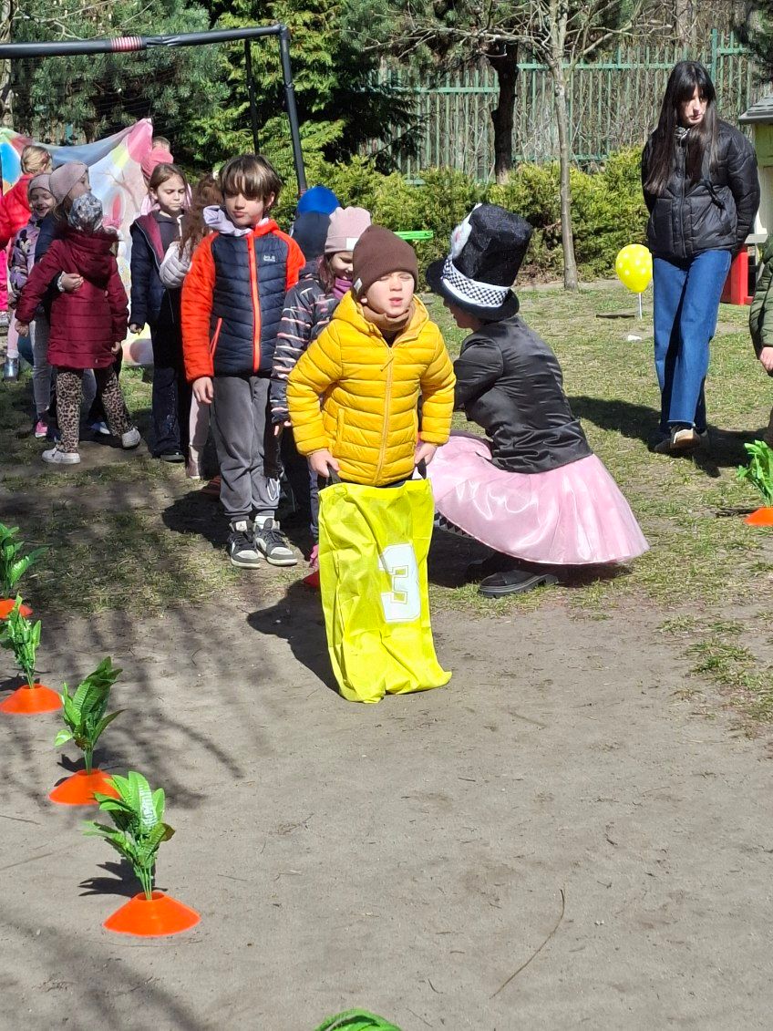 W ramach zajęć dzieci uczestniczyły w różnych zabawach ruchowych  w ogrodzie przedszkolnym, min. takich jak: poszukiwanie jajek w ogrodzie, przenoszenie jajek na łyżkach, skoki w workach slalomem między marchewkami, korowód z zajączkiem.