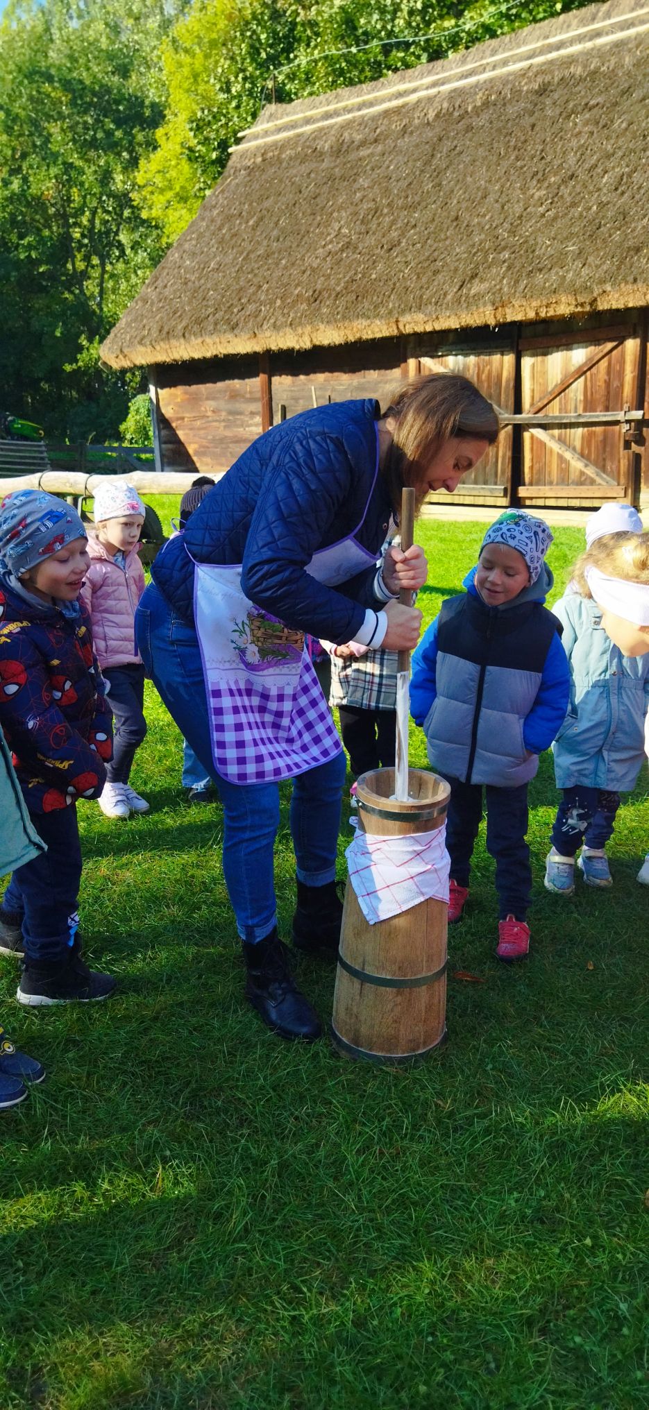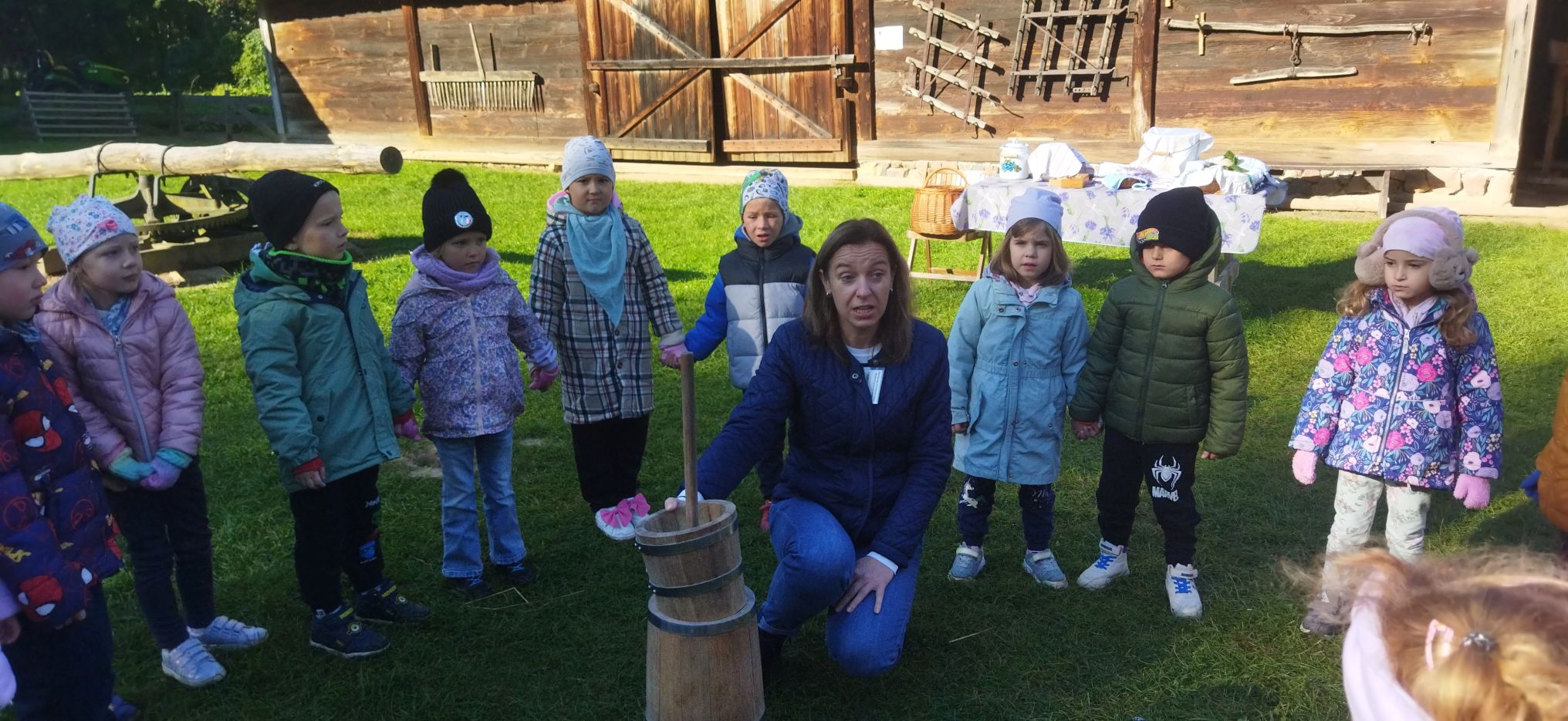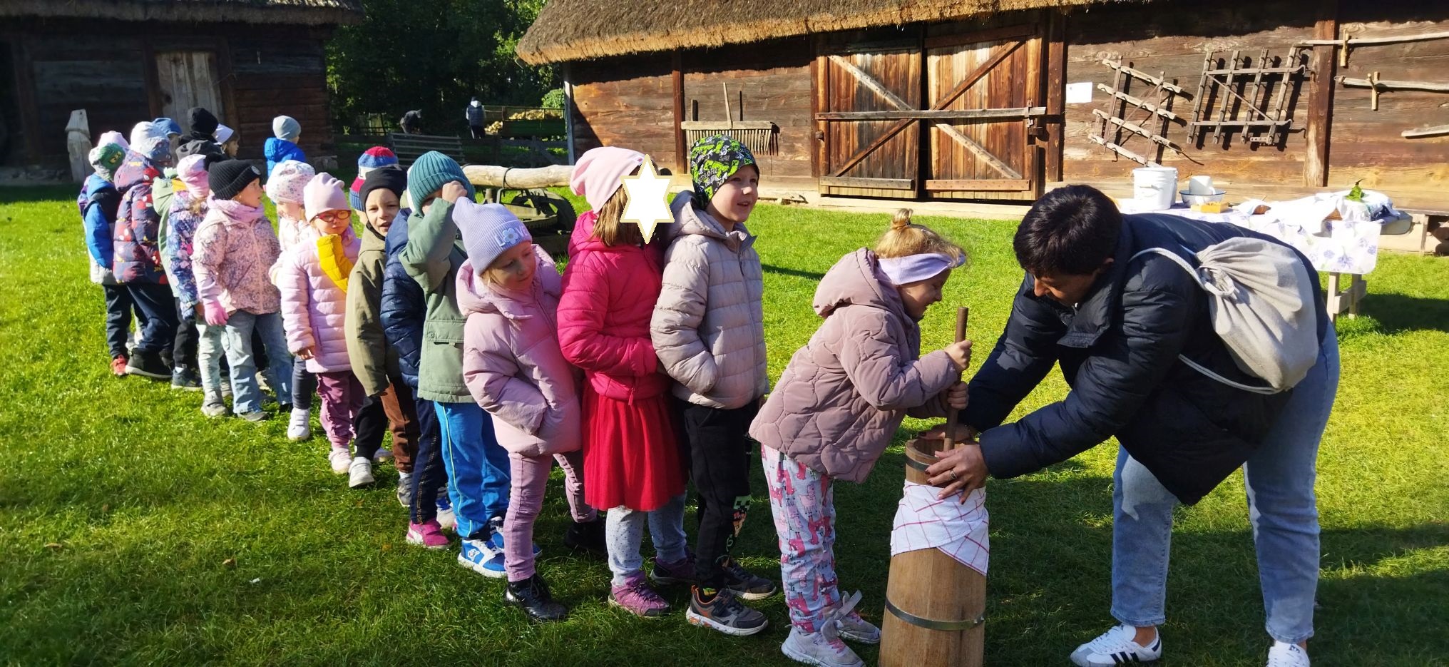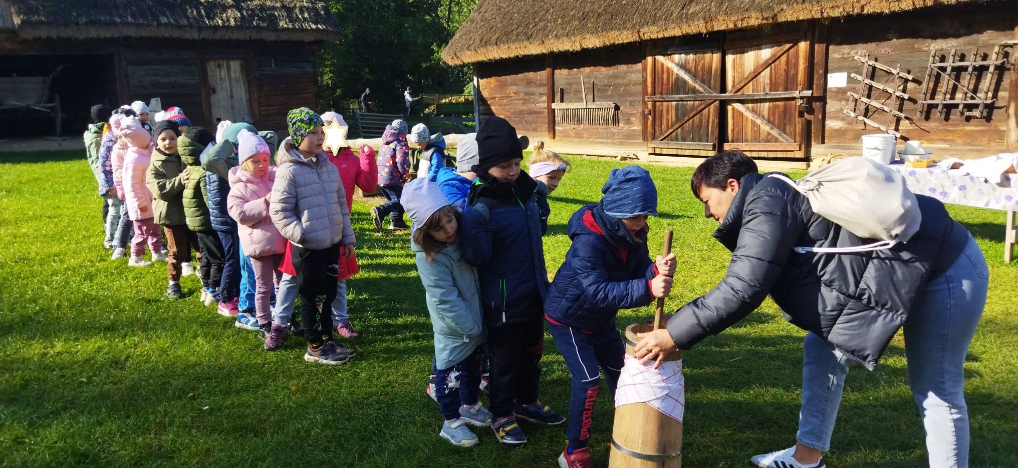Przedszkolaki zwiedziły starą kuźnię, szkołę, karczmę, remizę strażacką, kościół oraz olejarnię, czyli obrazy dawnej wsi. Wzięły też udział w warsztatach tradycyjnego wyrobu masła, po czym każde dziecko miało możliwość popróbowania własnego wyrobu.