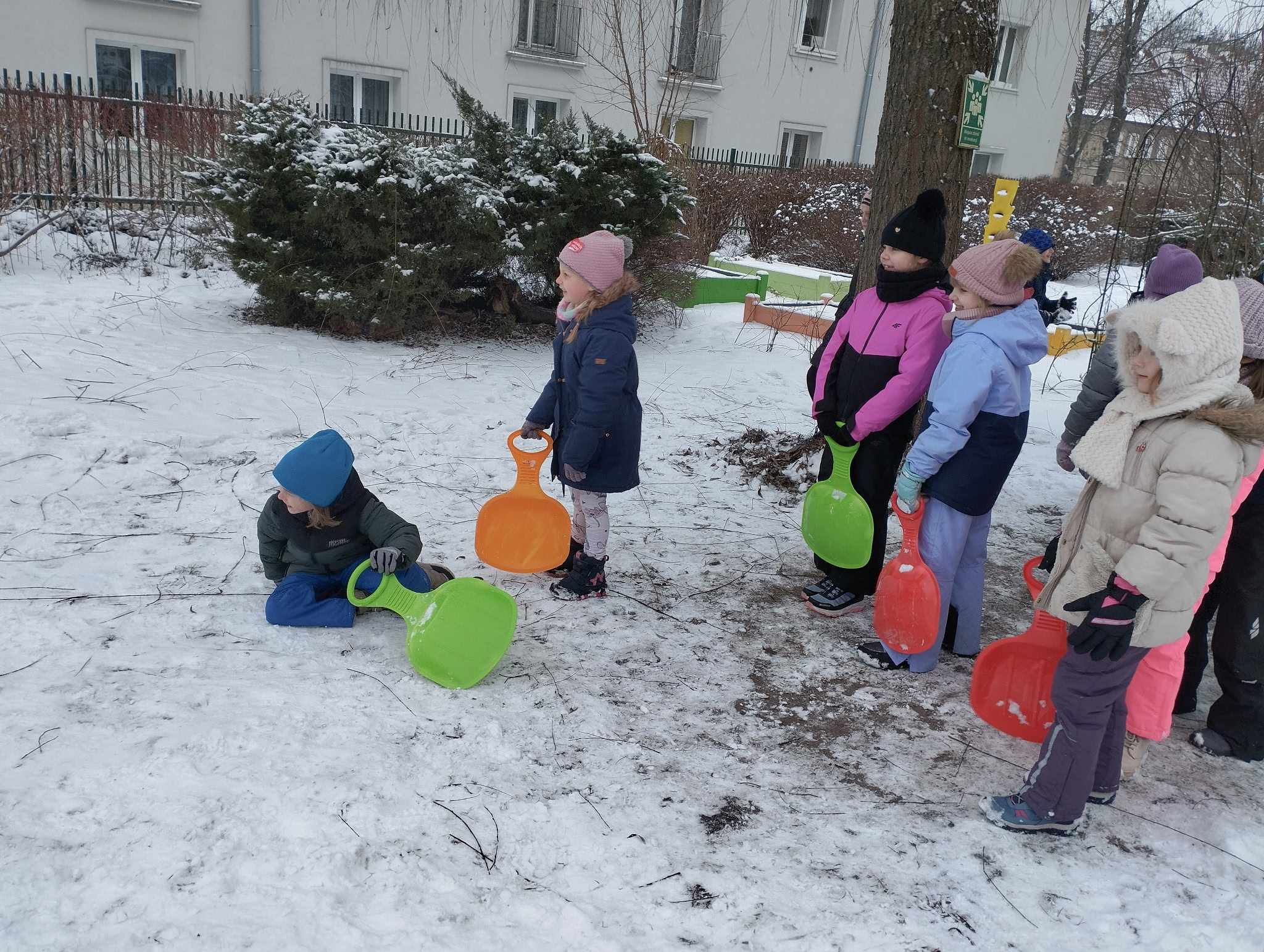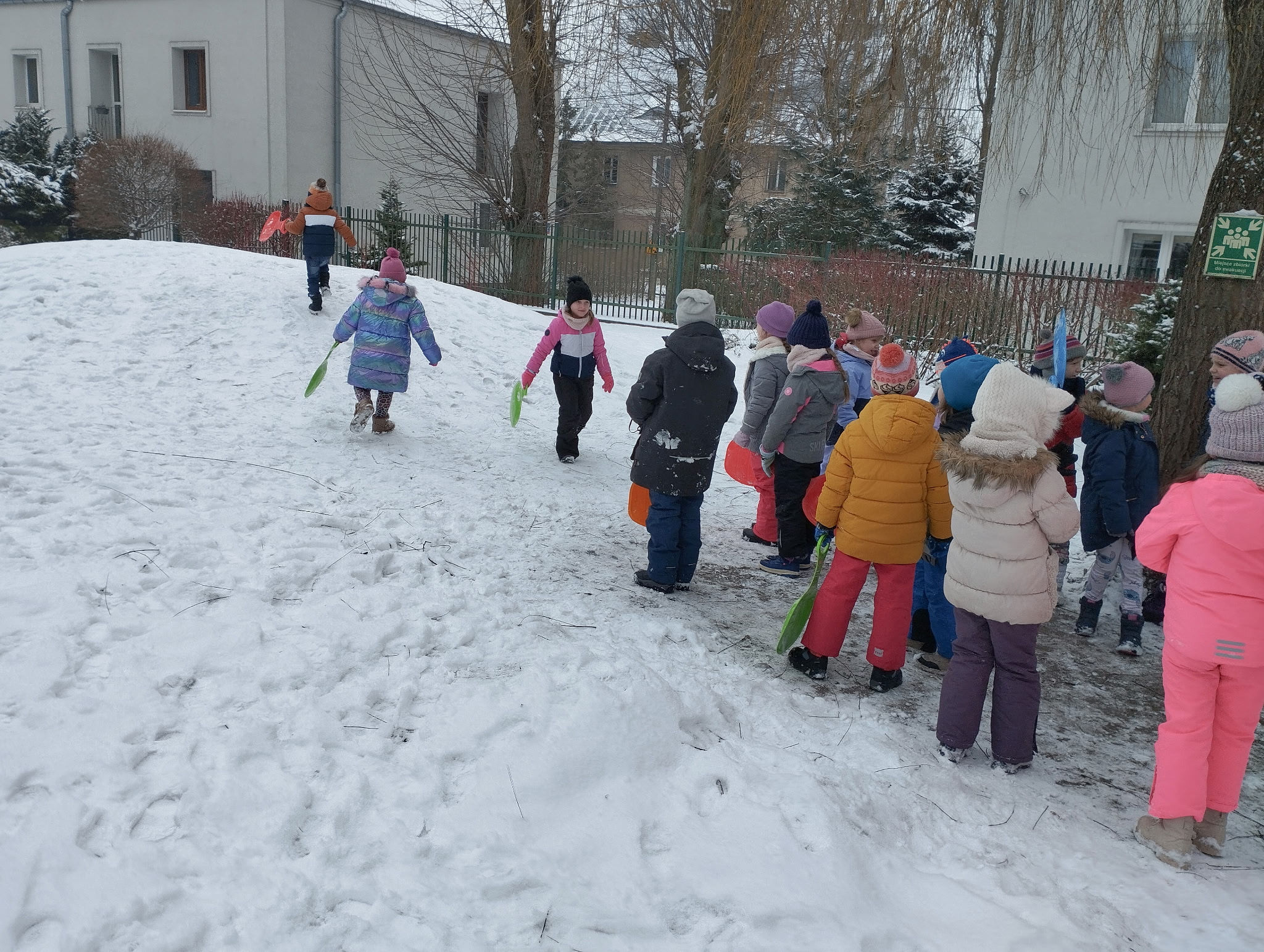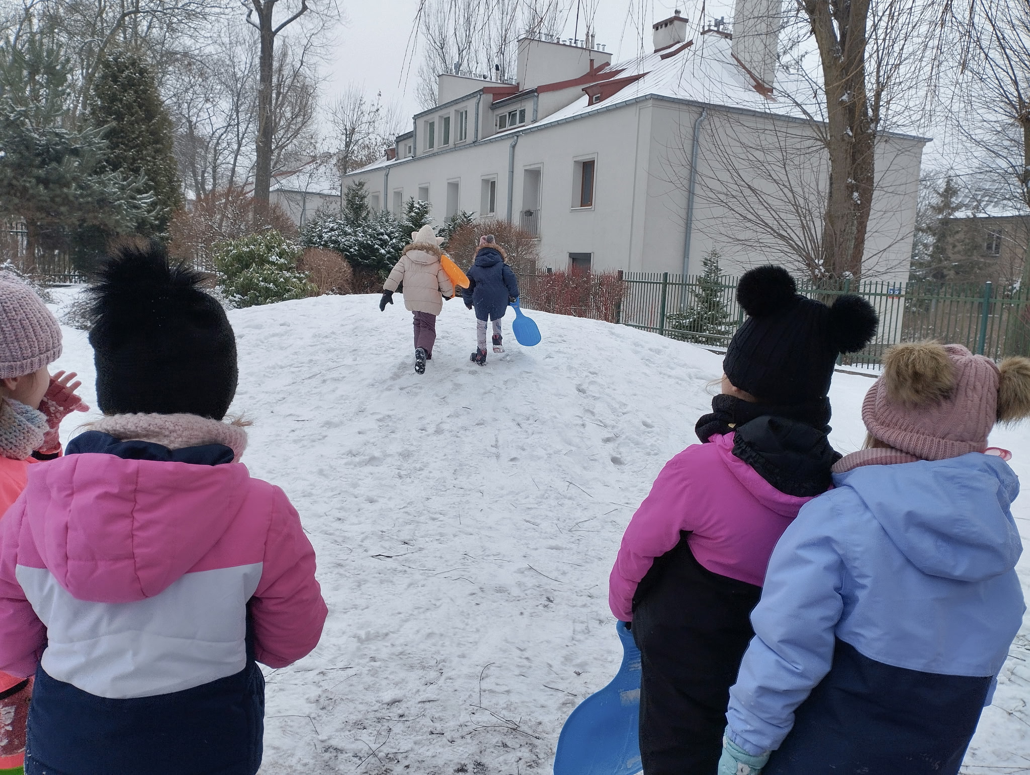 Przedszkolaki bawiły się na śniegu, rzucały się śnieżkami oraz zjeżdżały z górki na jabłuszkach. Uśmiechów i radości było co niemiara.