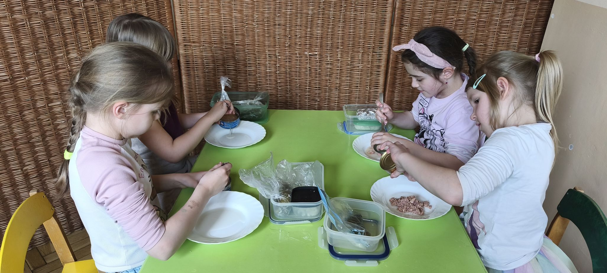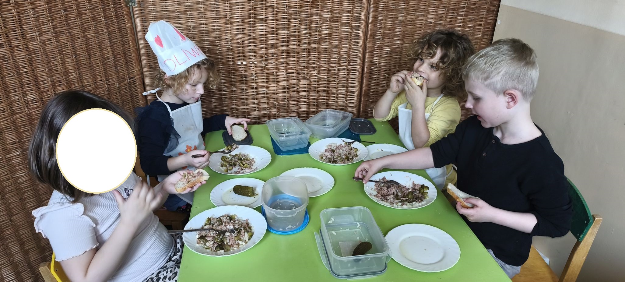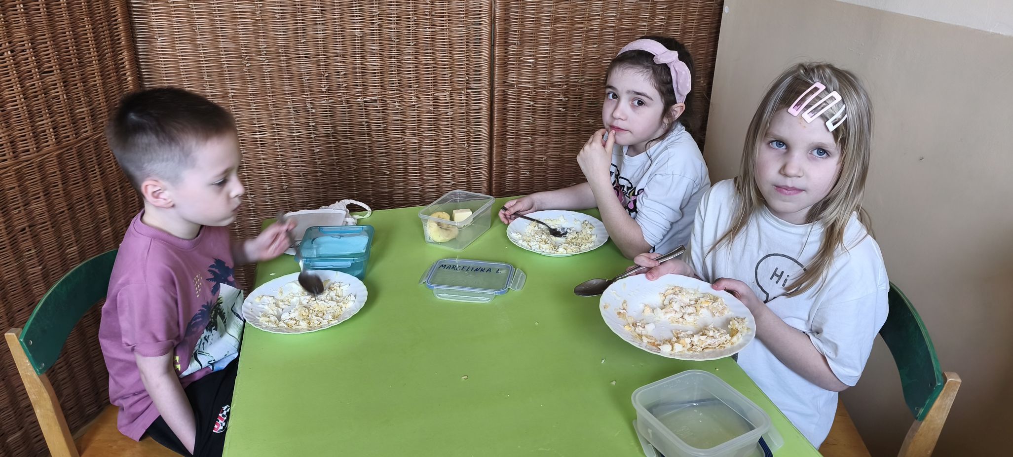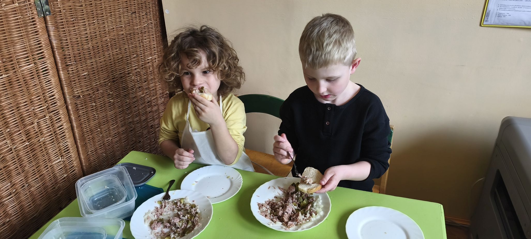 Podczas zajęć w miesiącu kwietniu - 13 i 15.04.2026 r., dzieci - uczestnicy projektu - przyrządziły sałatkę z jajkiem oraz kanapeczki z pastą z tuńczyka.