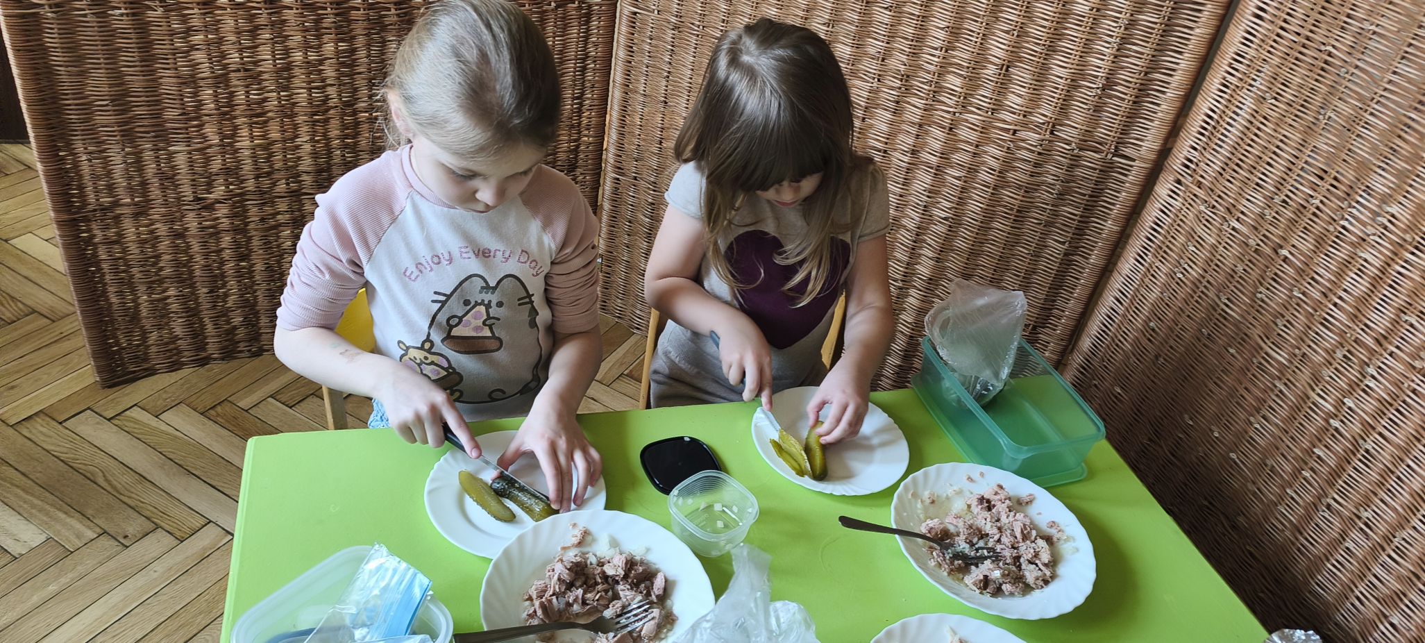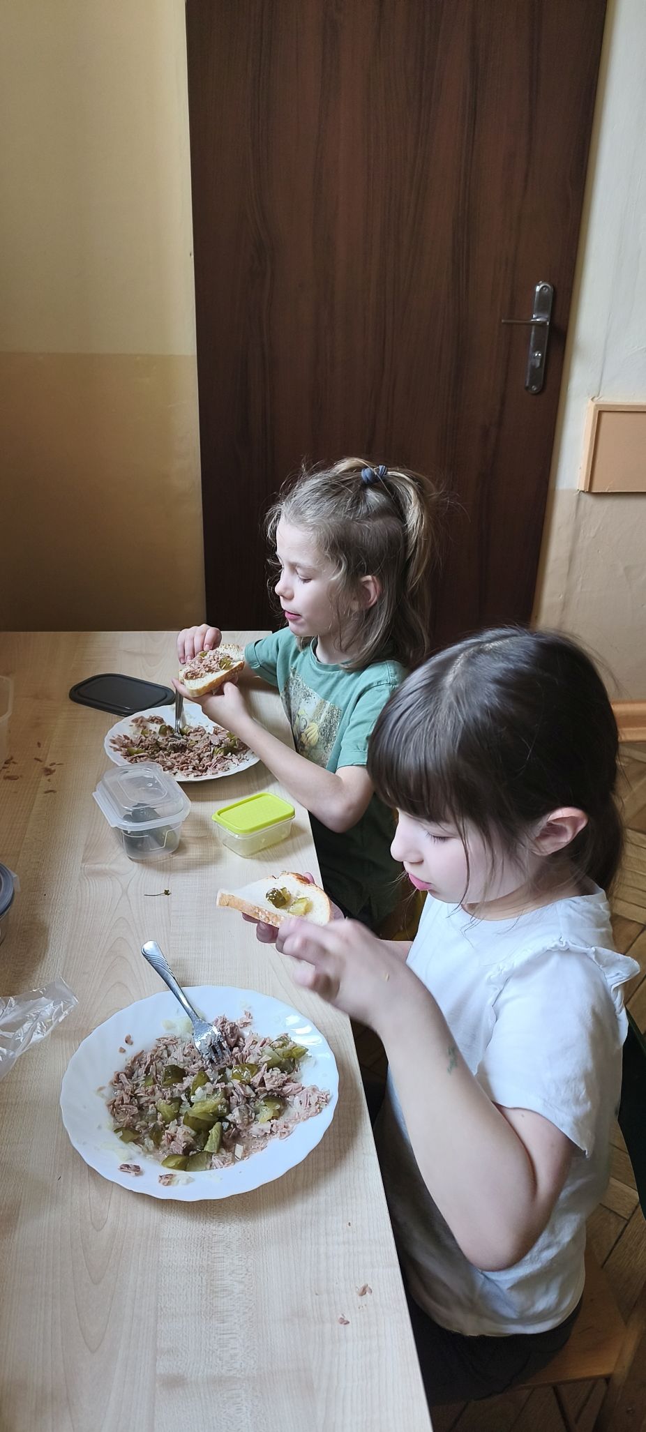 Sałatkę jajeczną doskonałą na kolację przyrządziły z pokrojonego w kostkę jajka, do którego dodały starte jabłko i żółty ser. Do pasty z tuńczyka wykorzystały oczywiście tuńczyka z puszki, do którego dodały pokrojoną w drobną kostkę cebulę oraz ogórka kiszonego.