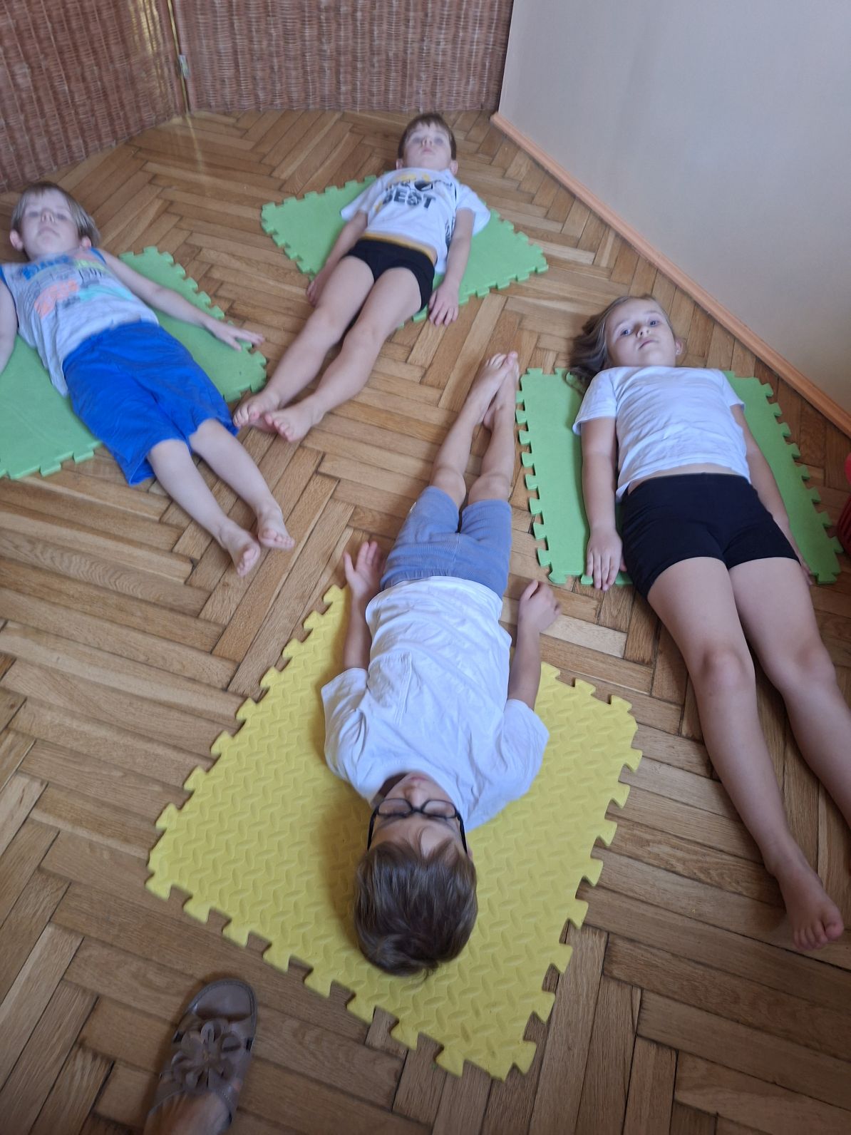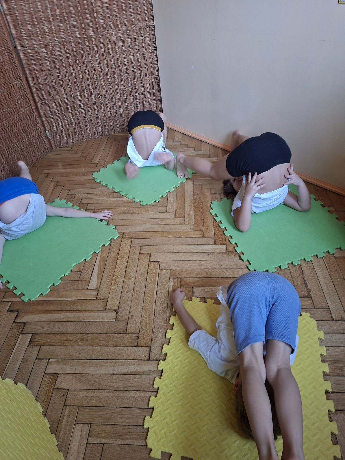 Tematem wiodącym zajęć było "Poznajemy pozycje wyjściowe". Dzieci poznały min.: klęk podparty, leżenie tyłem, leżenie przodem, itp. Wykonywały także ćwiczenia stóp z przyborem