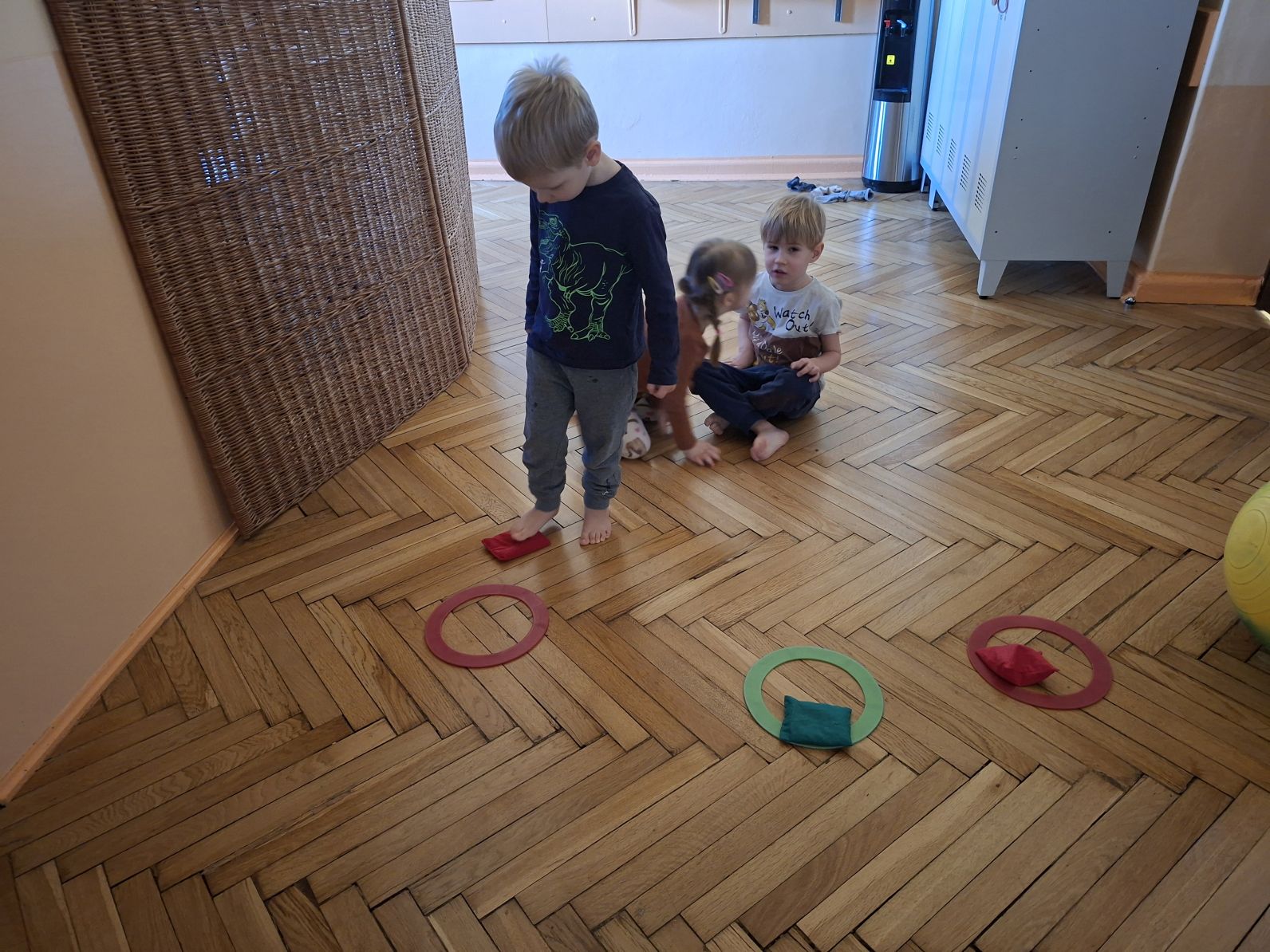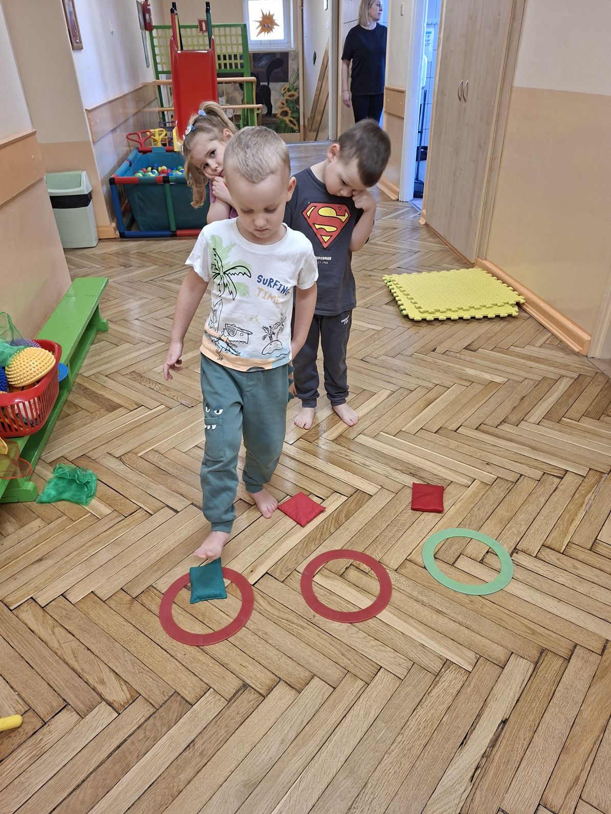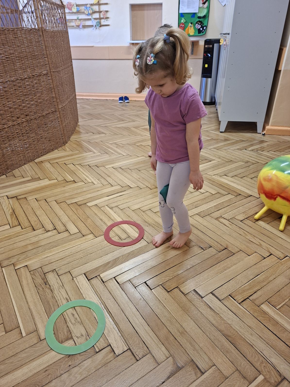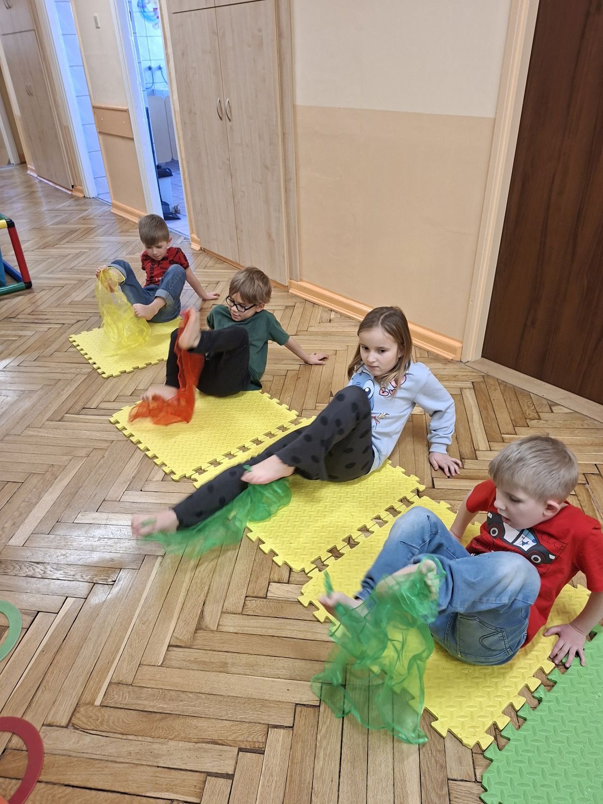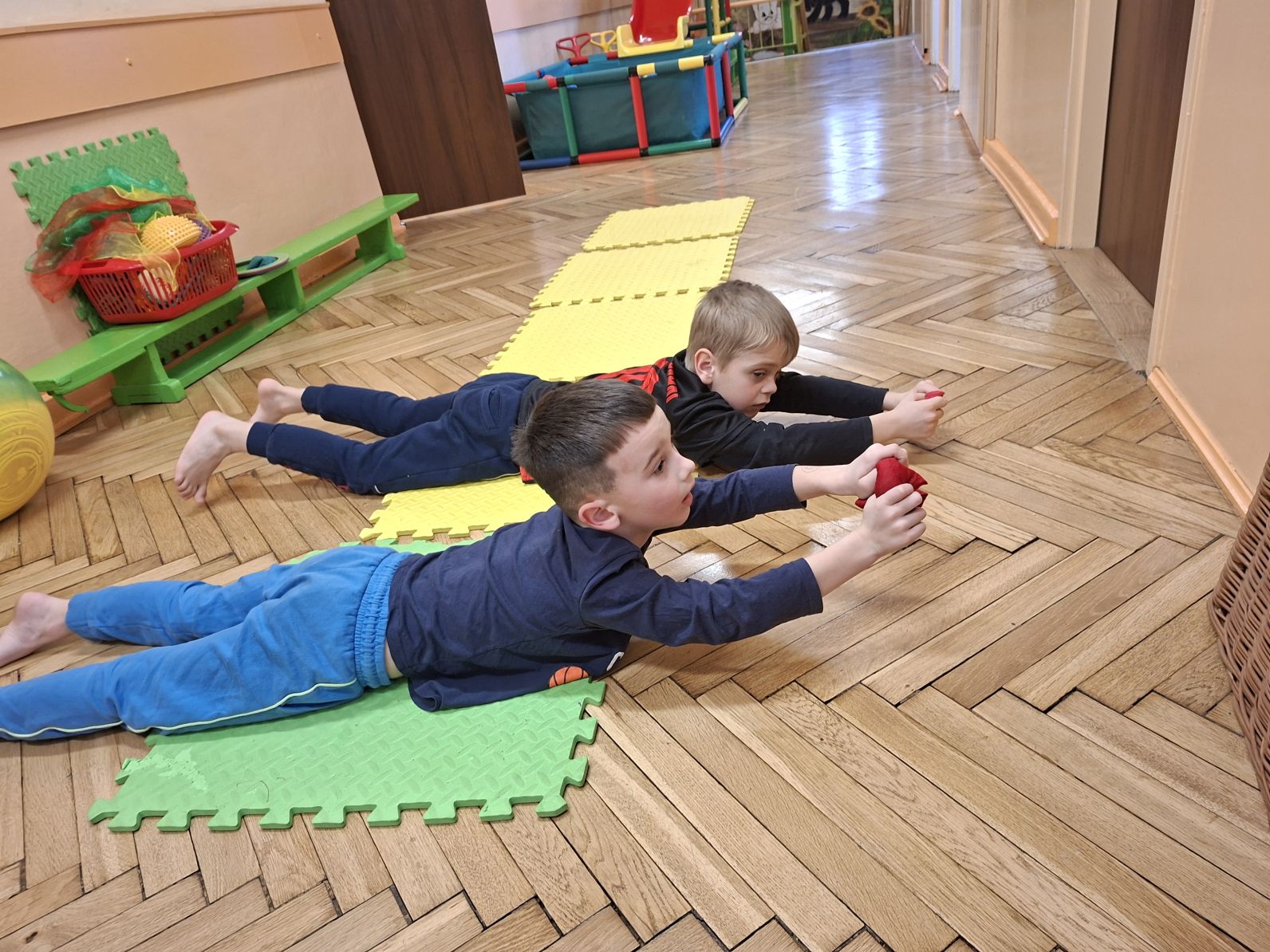 Dzieci wykonywały ćwiczenia poprawiające ogólną sprawność fizyczną dzieci, ćwiczenia przeciw płaskostopiu oraz wzmanjające mięsnie głębokie brzucha, pleców, barków, stabilizujące kręgosłup.