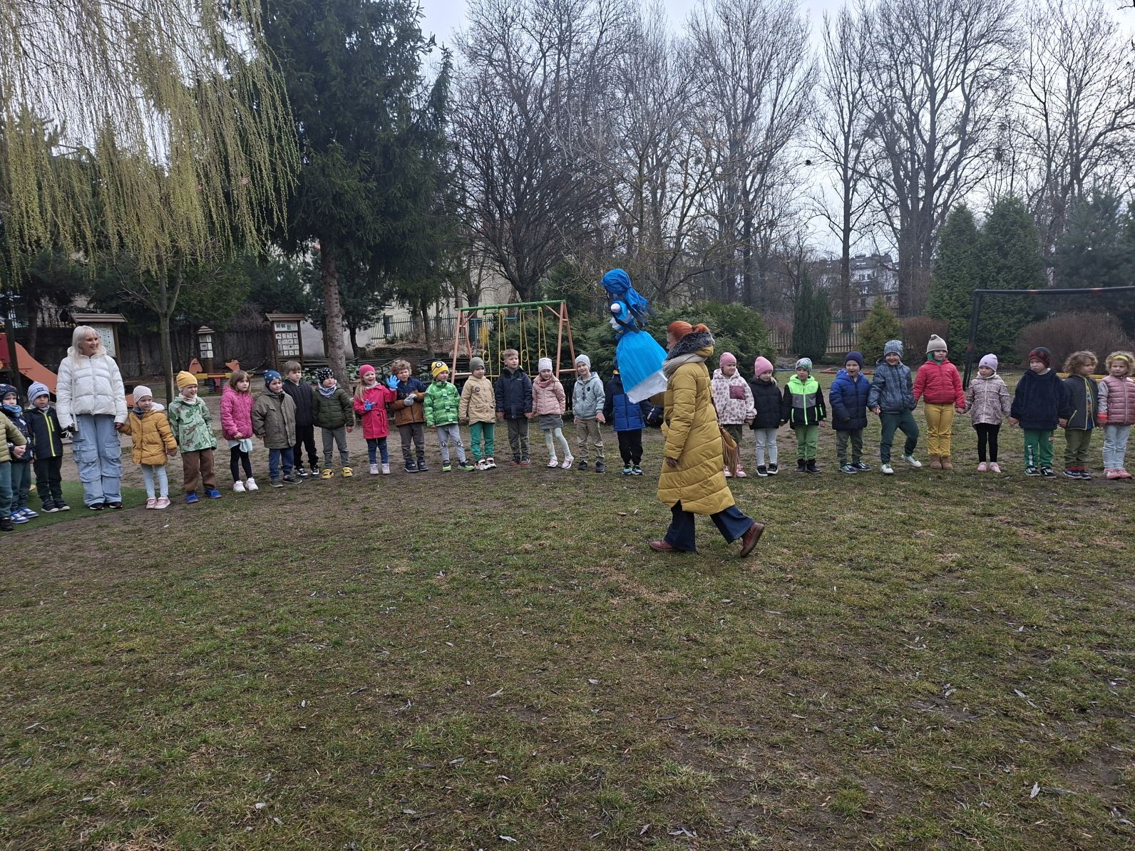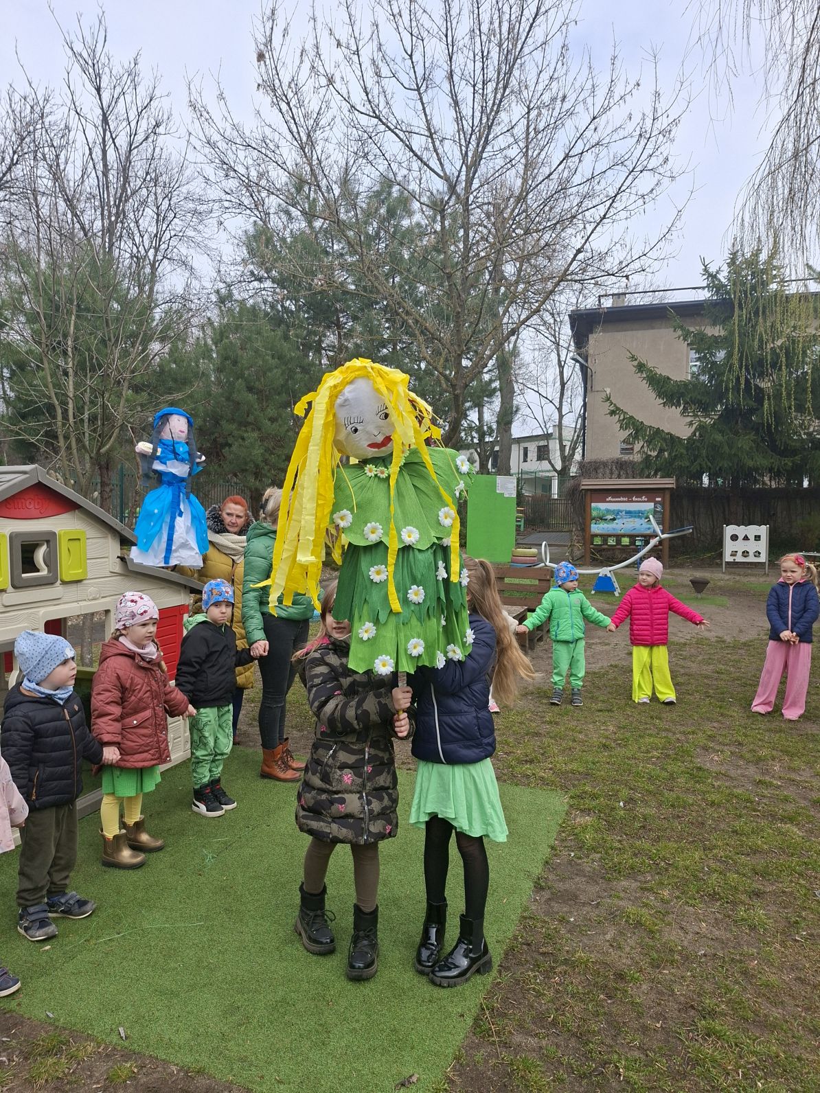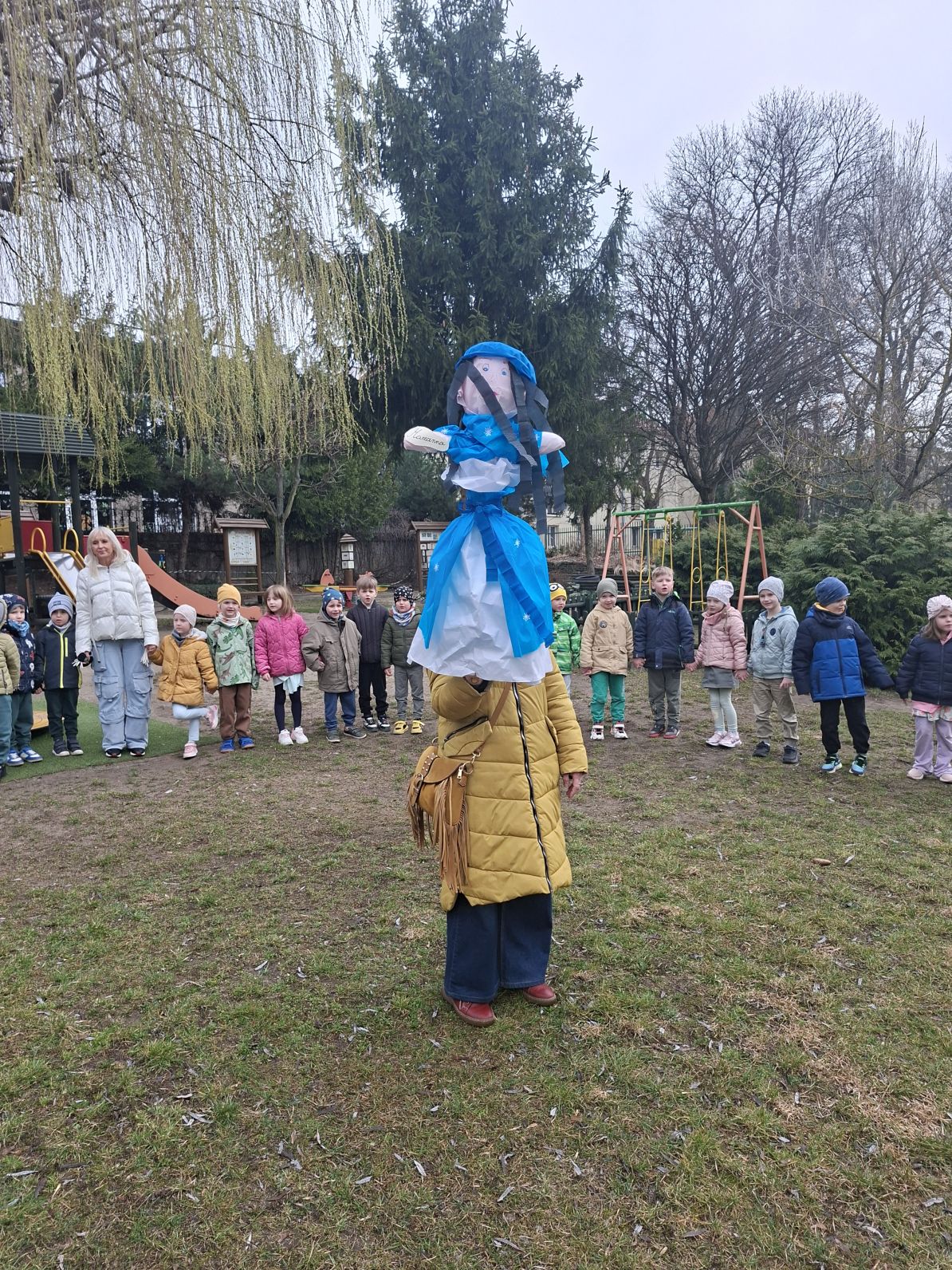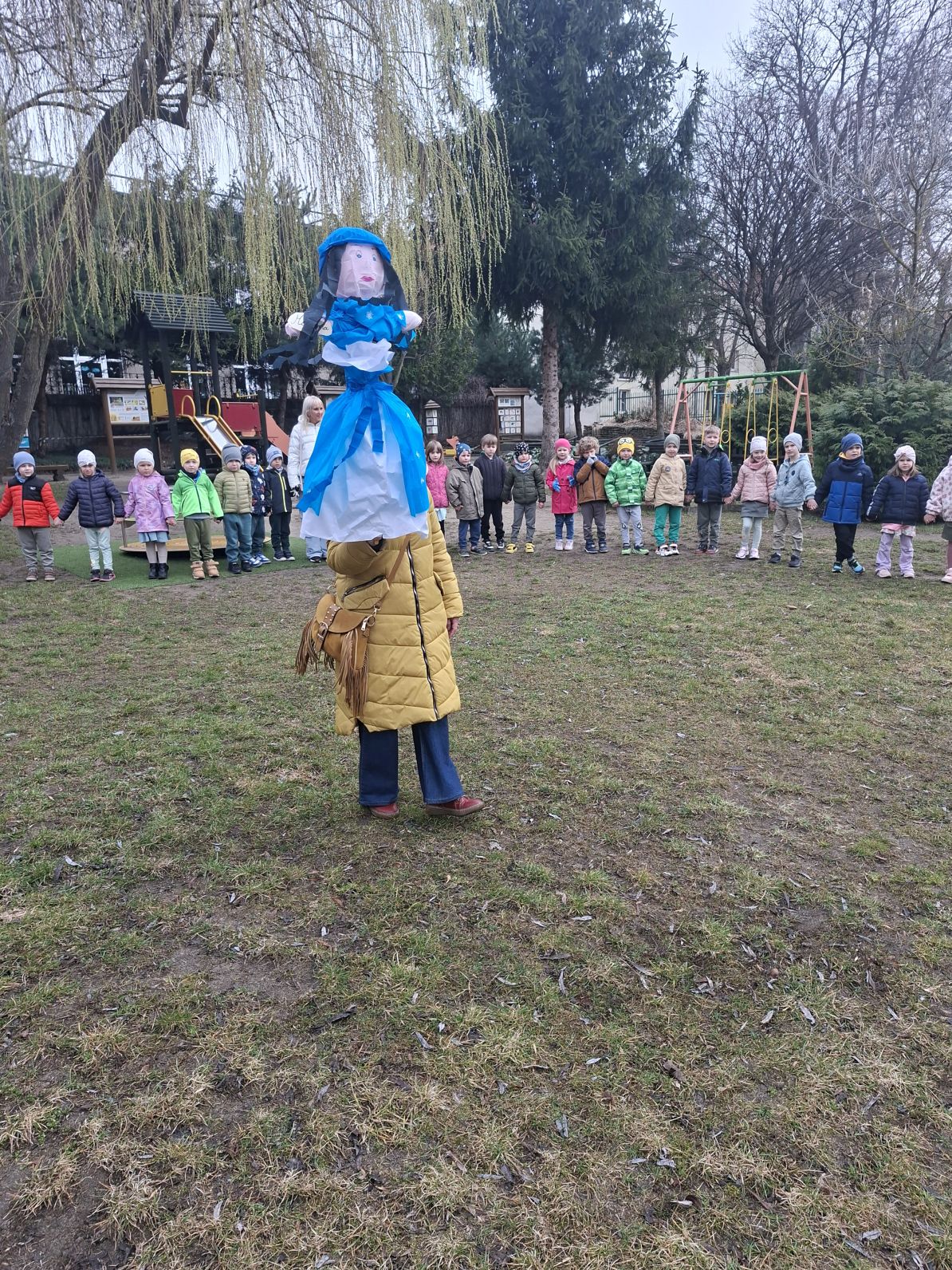 Wszystkie przedszkolaki wyruszyły do ogrodu przedszkolnego, gdzie w strumyku na znak odchodzacej zimy utopiliśmy Marzannę, a na jej miejsce pojawiła się pani Wiosna, którą dzieci przywitłay wiosenną piosenką.