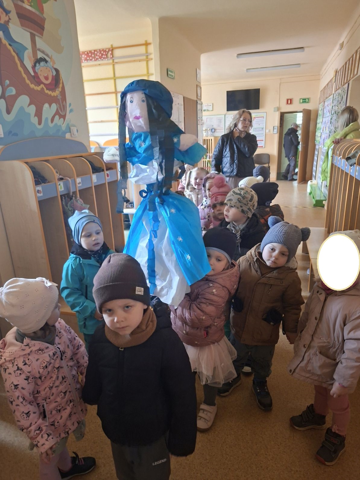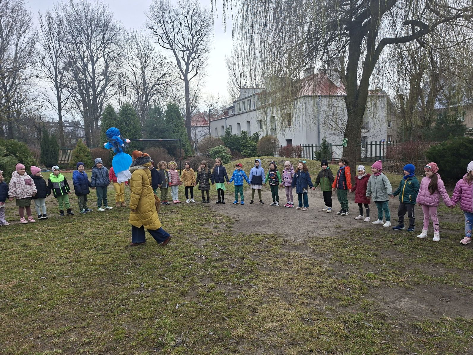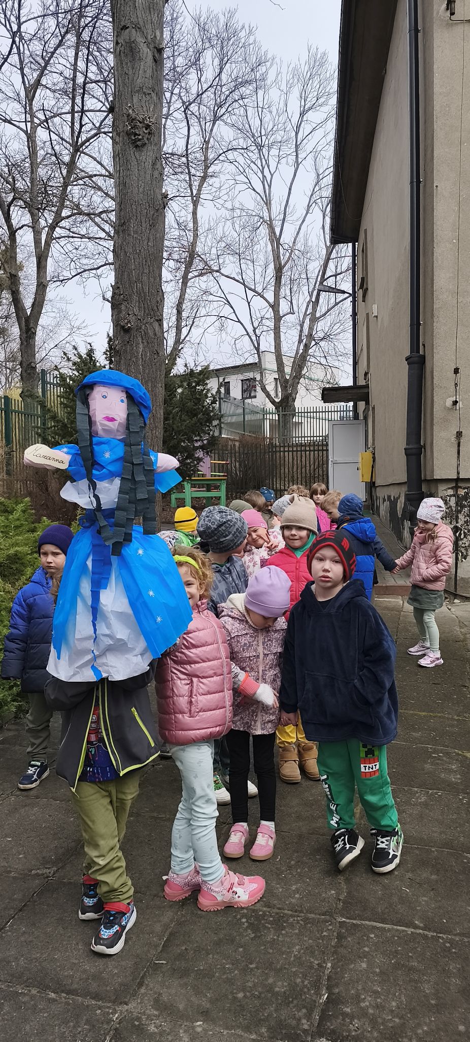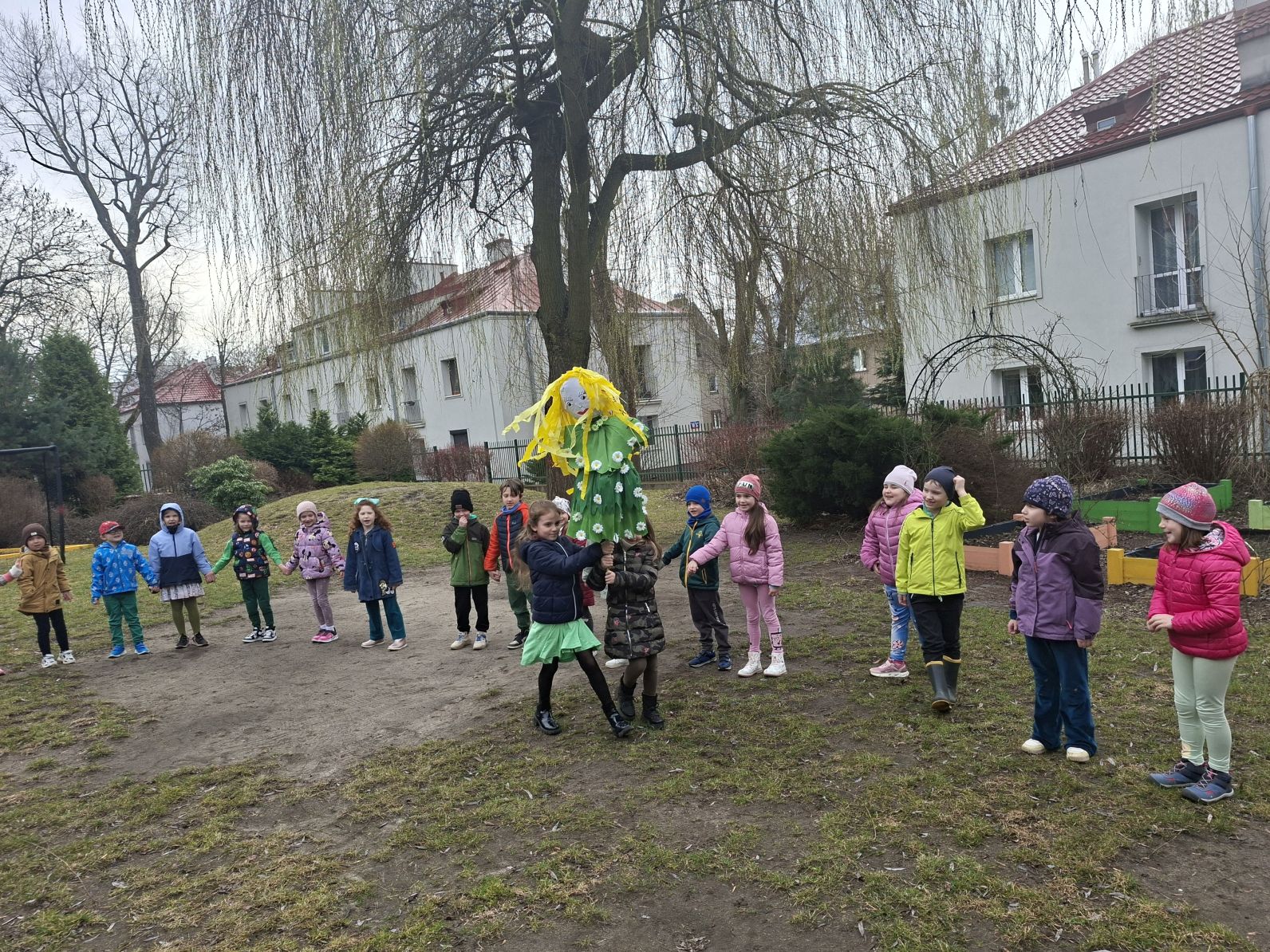 Wszystkie przedszkolaki wyruszyły do ogrodu przedszkolnego, gdzie w strumyku na znak odchodzacej zimy utopiliśmy Marzannę, a na jej miejsce pojawiła się pani Wiosna, którą dzieci przywitłay wiosenną piosenką.