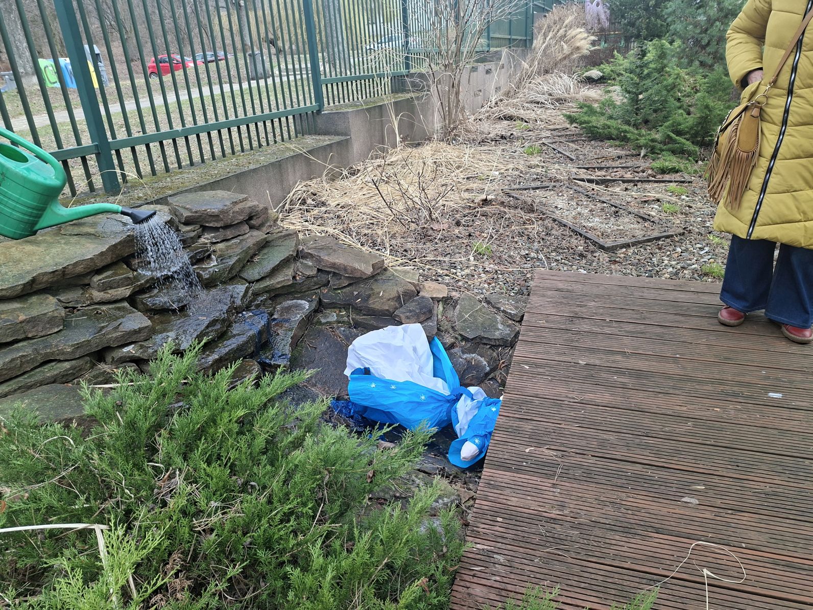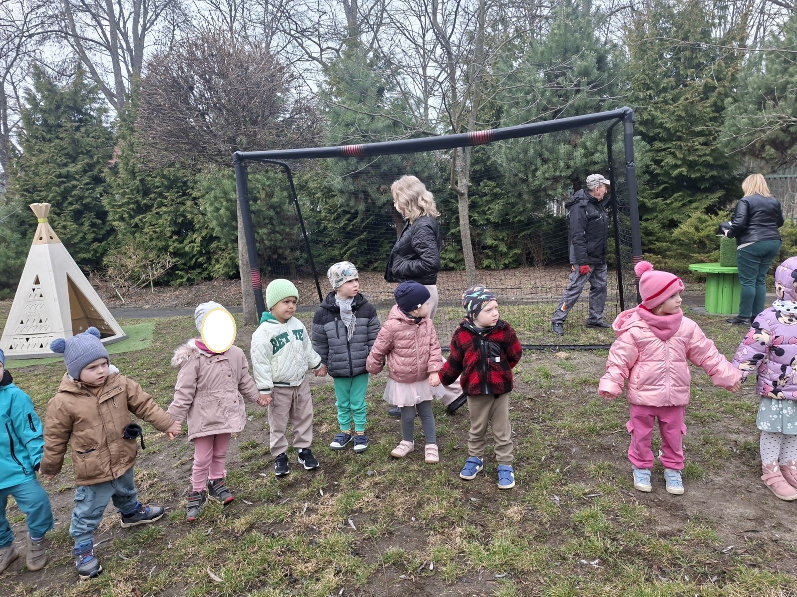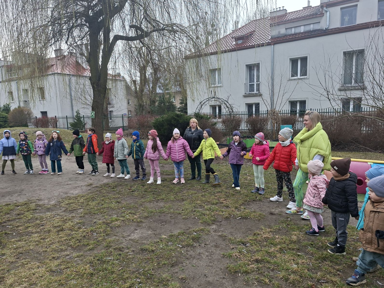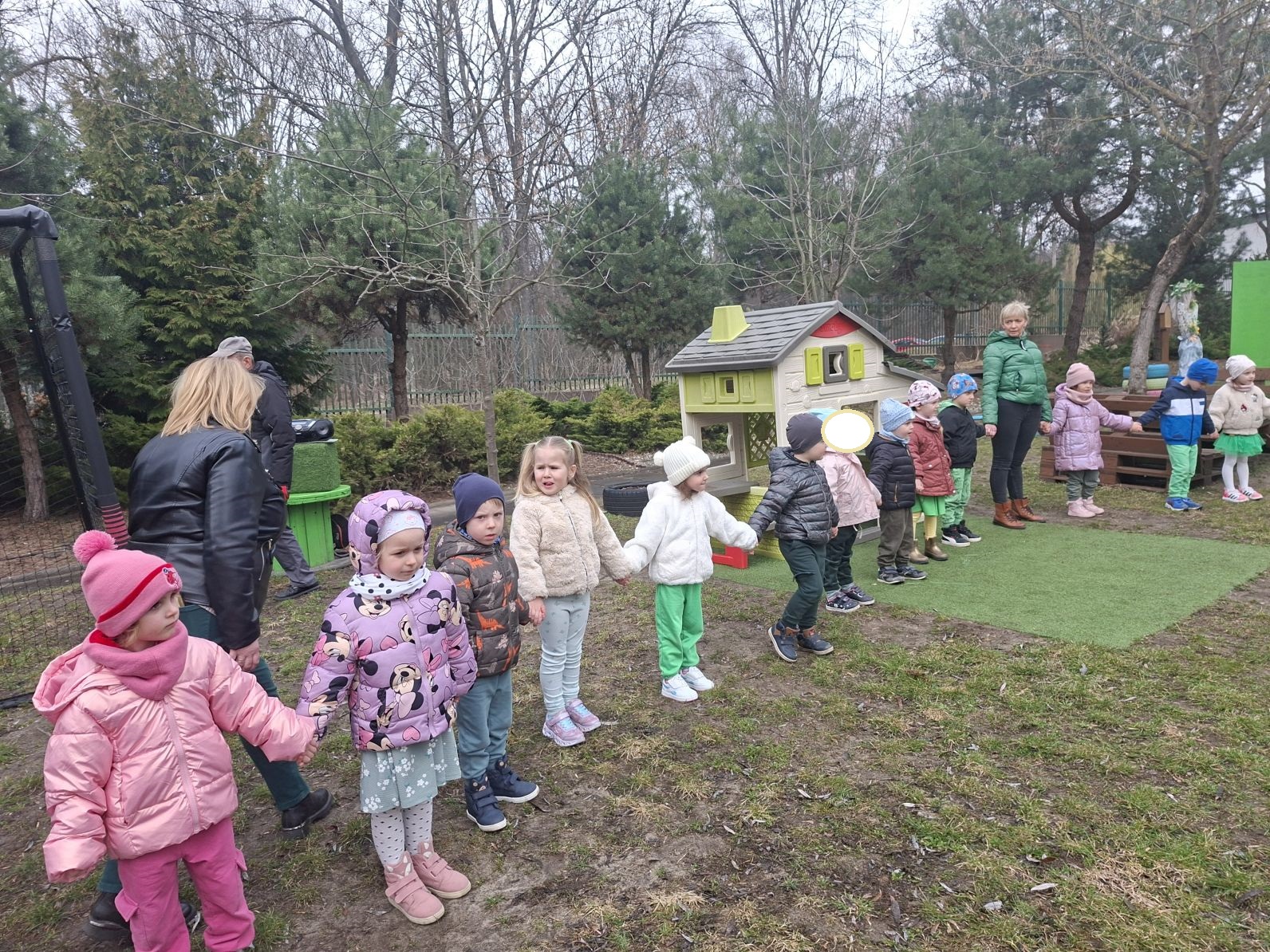 Wszystkie przedszkolaki wyruszyły do ogrodu przedszkolnego, gdzie w strumyku na znak odchodzacej zimy utopiliśmy Marzannę, a na jej miejsce pojawiła się pani Wiosna, którą dzieci przywitłay wiosenną piosenką.